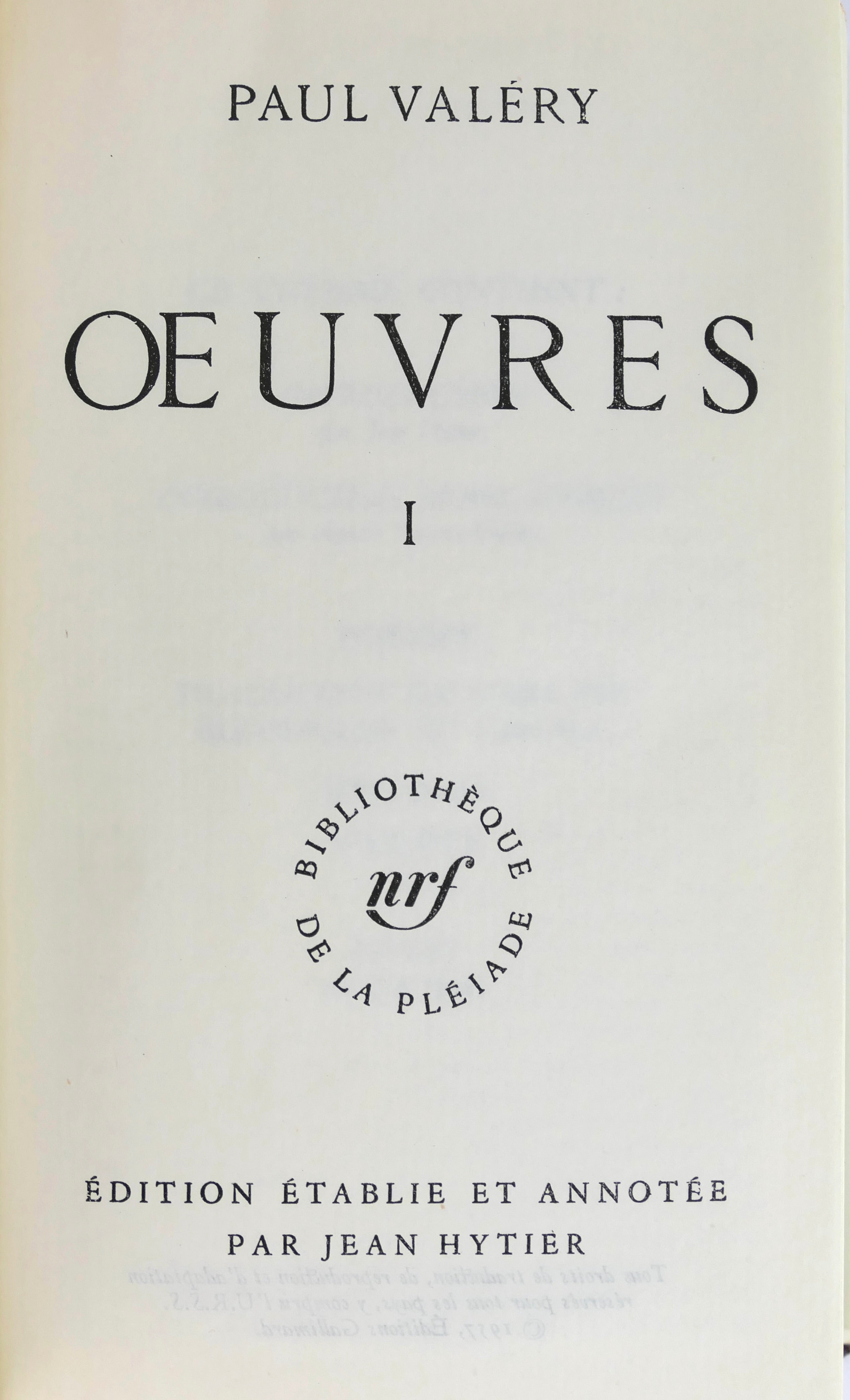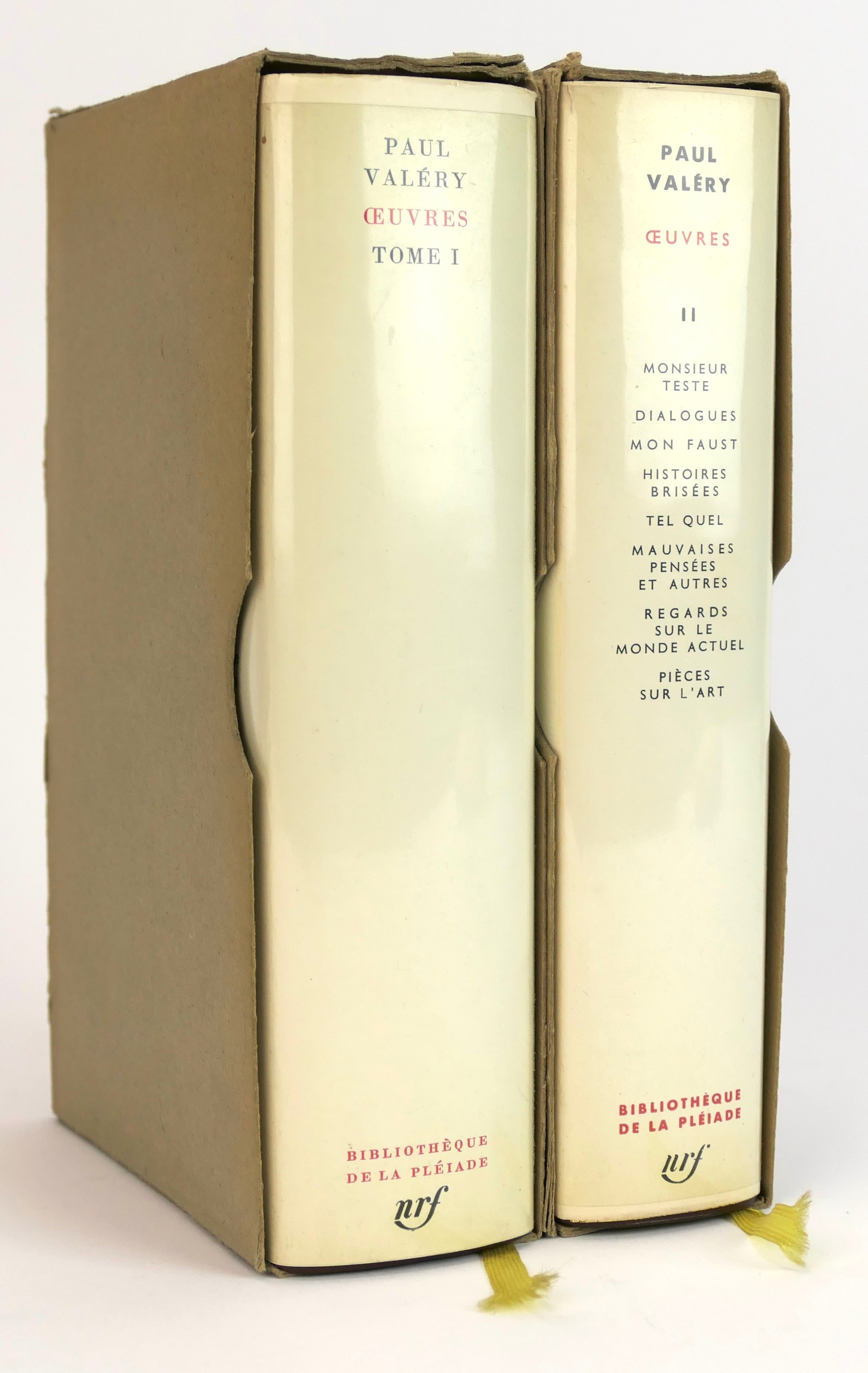 Two French language volumes of Paul Valéry's complete works. Hardcover. 8vo. 1829 pp; 1670 pp. Bound in leather, gold lettering and decoration to spine. Dj's in pristine condition, protected by publisher's mylar plastic cover, in publisher's slip cases. Very fine.