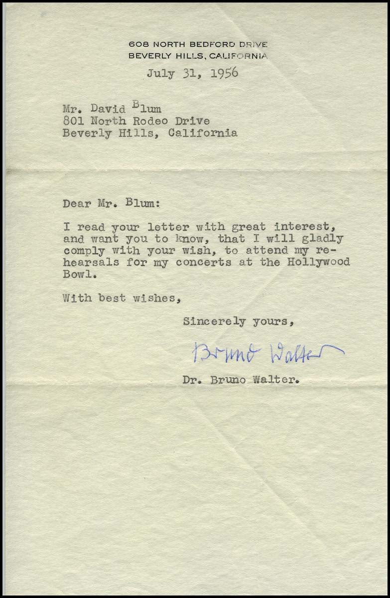 Walter, Bruno. (1876–1962). Signed Letter. One page TLS to David Blum, the symphonic conductor and writer on classical music, stating that he "will gladly comply with your wish, to attend my rehearsals for my concerts at the Hollywood Bowl." July 31, 1956. Signed "Bruno Walter" in blue ink and in fine condition.