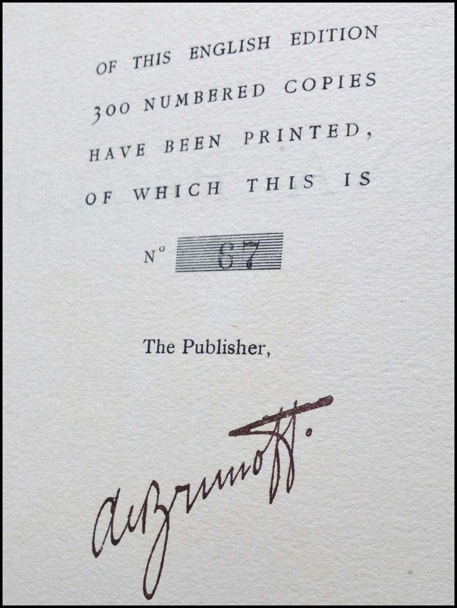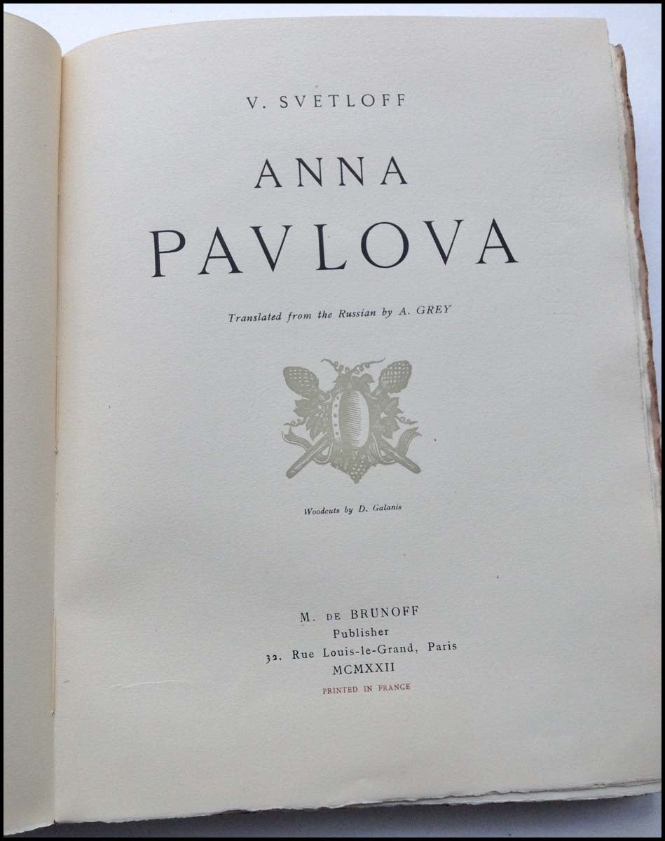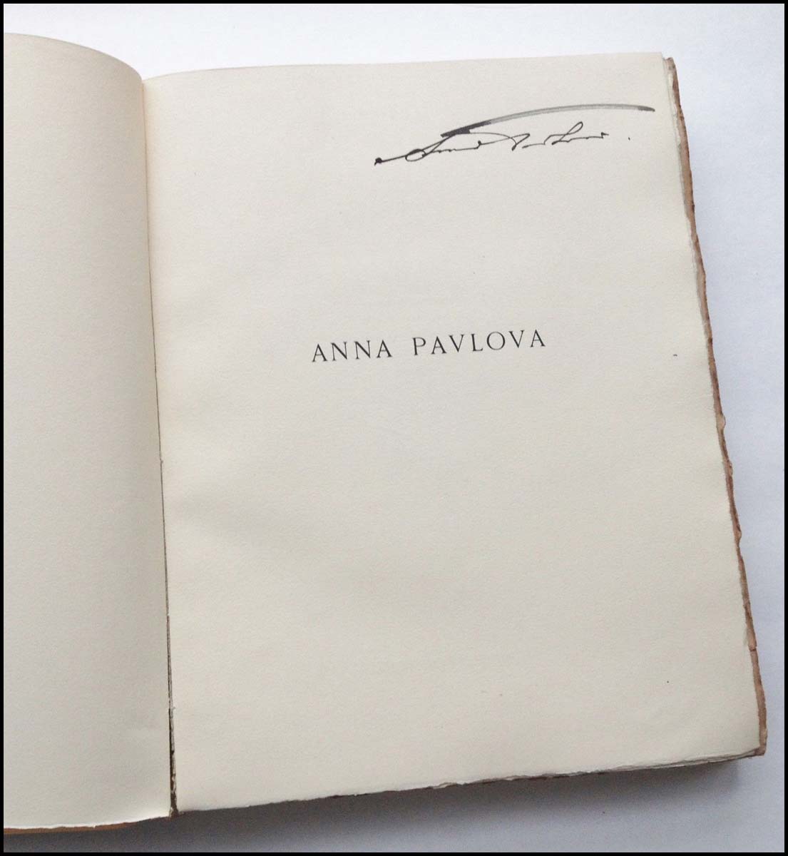 Translated from the Russian by A. Grey. Large 4to, original lettered paper wrappers, with original slipcase. 194 pp. 23 plates by Bakst, Barbier, Serov, Soudekine, and others including photogravures and woodcuts in margins etc.. A very bold original signature by Anna Pavlova on the half-title. Number 67 of 300 copies, also signed by Publisher. This being the copy of dancer Elsa Heilich, inscribed on the ffe to her on Christmas, 1930. Pages bright and clean, wear to slipcase and spine with a small tear starting lower right front, some spliting from the block throughout. Reference: Derra de Moroda 2452. Magriel 126.