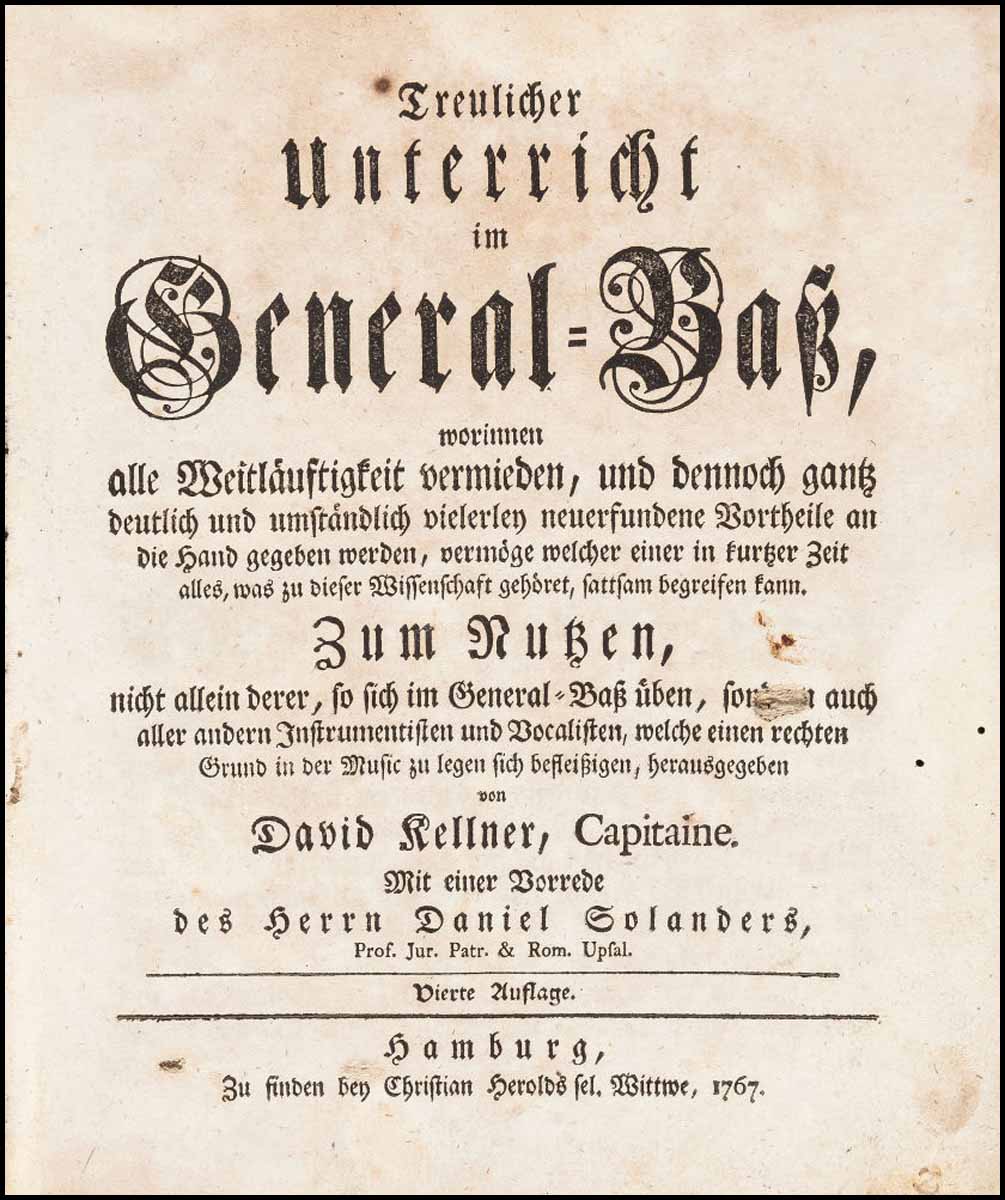 "Kellner's primary fame rests on his popular thoroughbass manual, Treulicher Unterricht im General-Bass, published in Hamburg in 1732, and reissued in numerous editions until as late as 1796, including Swedish (1739) and Dutch (1741) translations...The long-lived popularity of Kellner's treatise, especially in Sweden, where it was almost the only instructional work of its type in use for a long period, can be explained by its brevity (less than 100 pages) and the conciseness of the explanations. The work stands in marked contrast to the more important thoroughbass works of the period by [Johann] Mattheson and [Johann David] Heinichen, which were exceedingly complex, lengthy and undoubtedly expensive. Kellner divided his book into seven chapters: 1. On intervals, chords, regulating the parts; 2. On the use of the figures; 3. On the natural Ambitus of keys and the accompaniment; 4. On unusual progressions which deviate from natural ones; 5. On the modulation [Ausweichungen] of keys; 6. On the nature of consonances; 7. On the use of dissonances" (George J. Buelow in Grove Music Online).