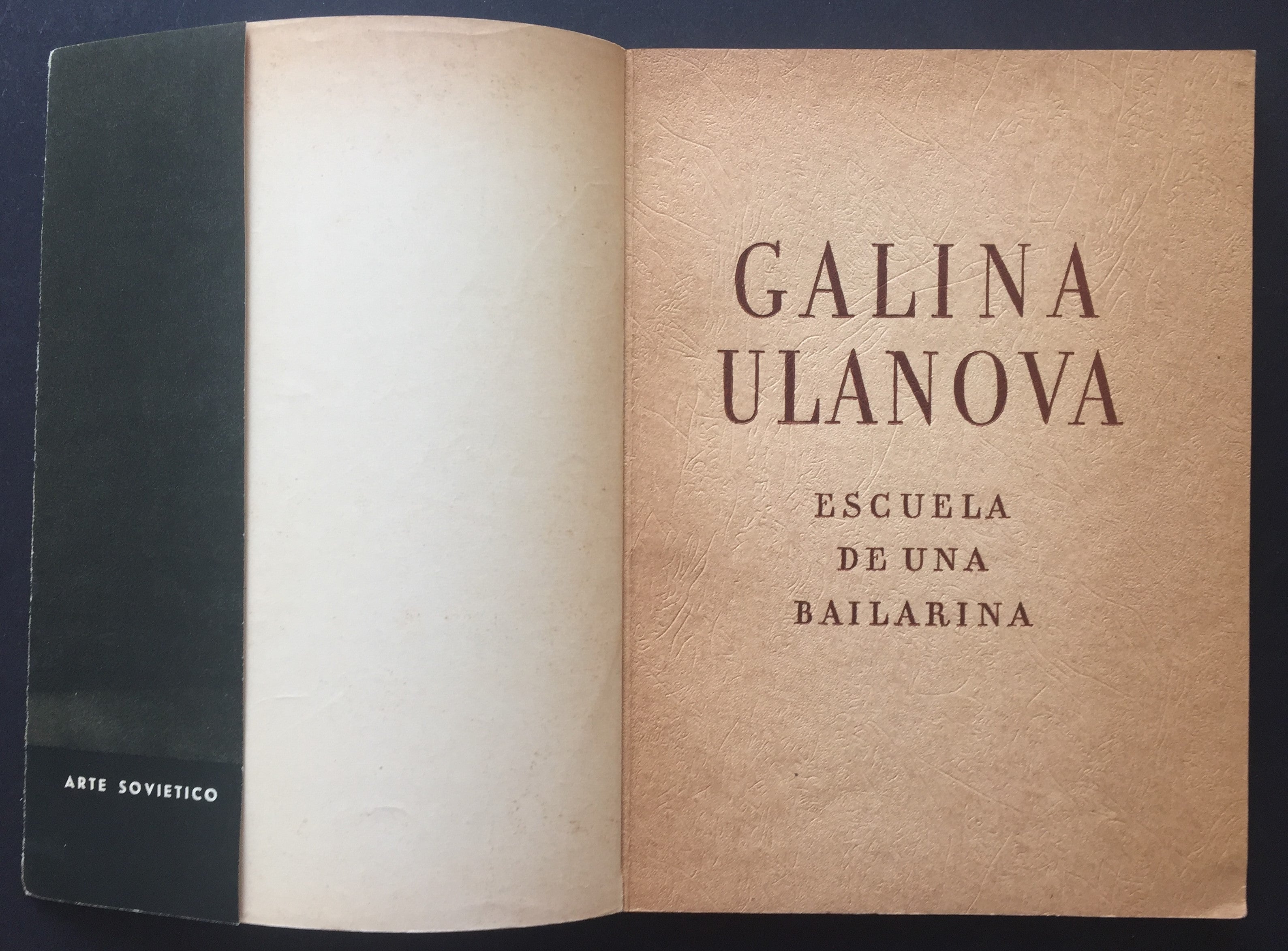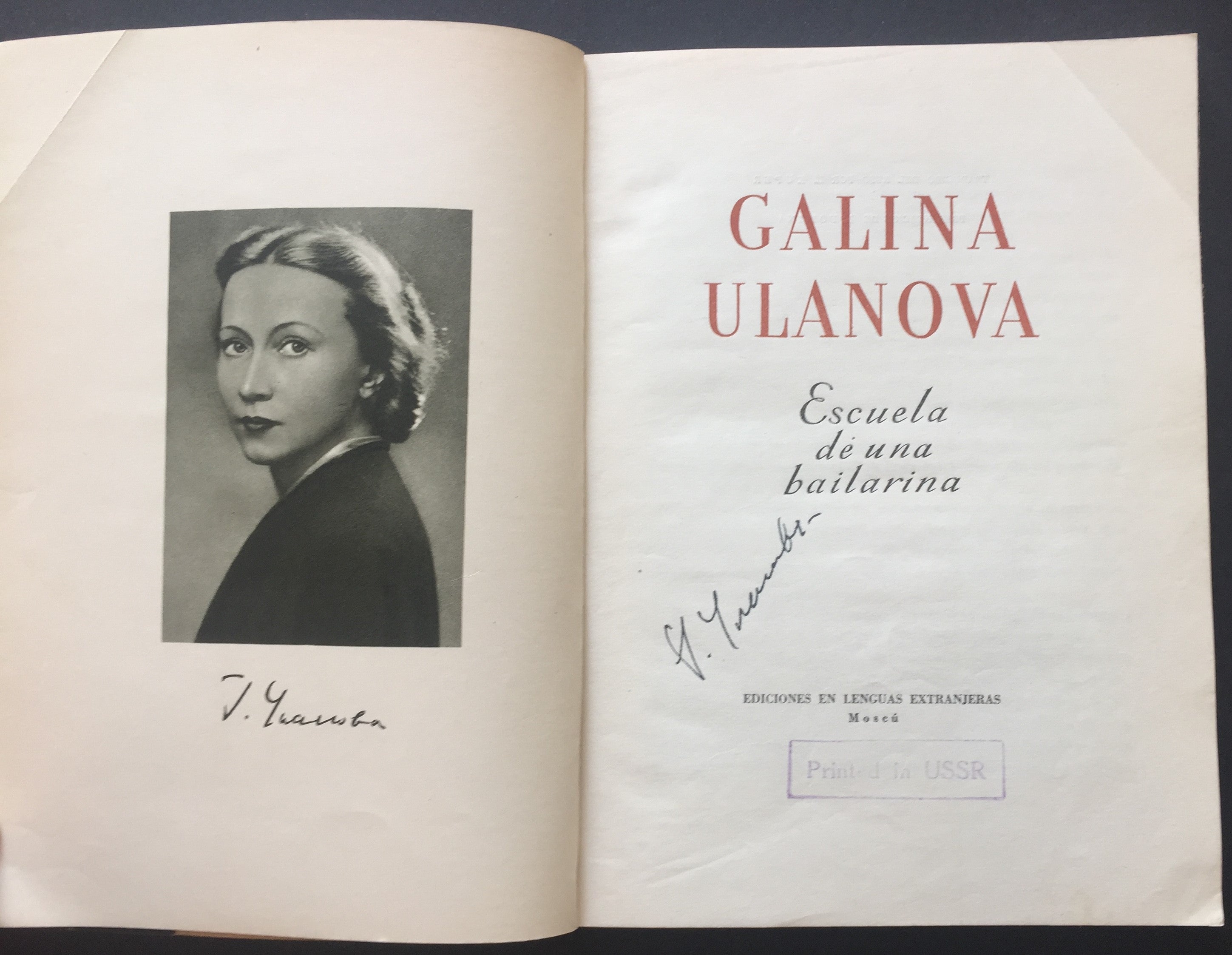 Signed book from the the legendary Bolshoi star, considered one of the greatest ballerinas of the twentieth century. This Spanish edition of the Russian biography of Ulanova, with a long final section of photographs, has been signed on the title page by the ballerina. 32; 22 pp. Softcover, with dust jacket. Overall toning; shelf wear and a few scratches to jacket; overall in very good condition. 6.5 x 8.5 inches (16.5 x 21.7 cm).