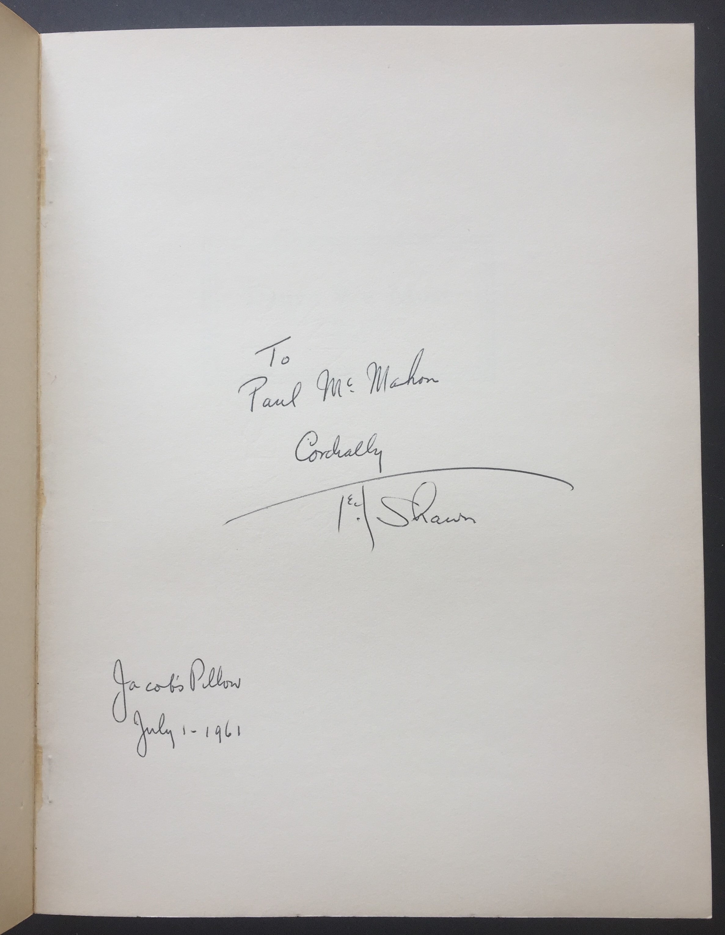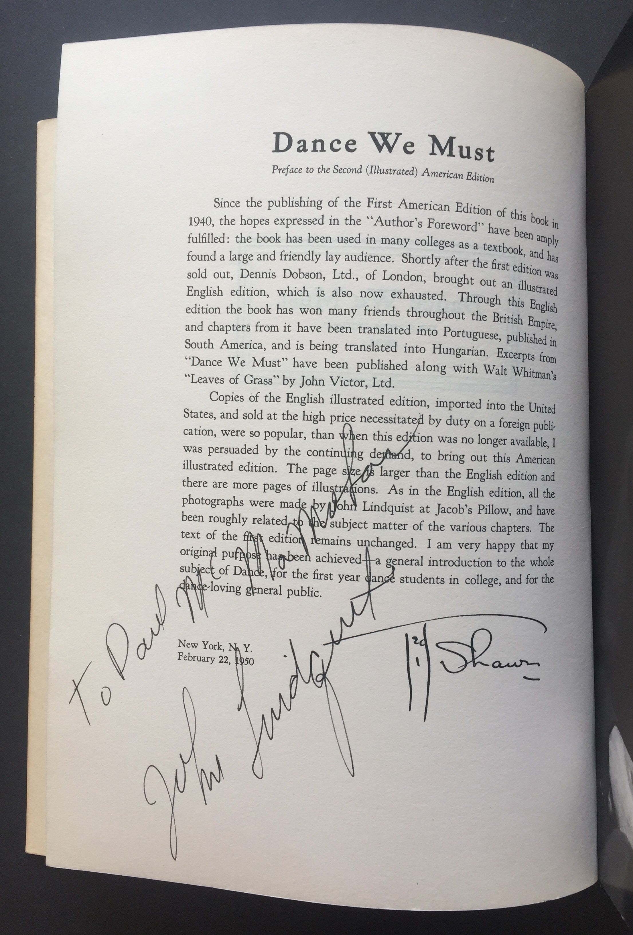 Signed book from the influential modern dancer and choreographer, founder with his wife Ruth St. Denis of the Denishawn dance company and of the Jacob's Pillow dance festival. He has signed and inscribed on the front free endpaper to Paul McMahon and dated Jacob's Pillow, July 1, 1961; the book has also been inscribed to McMahon on the page of the preface by Jacob's Pillow photographer John Lindquist. The volume contains lectures delivered by Shawn at the George Peabody College for Teachers in 1938, first published in 1940 and republished with illustrations in 1950. 148 pp. Softcover; light toning and a few scratches to the wrappers; overall in fine condition. 8.25 x 11 inches (21 x 28 cm).