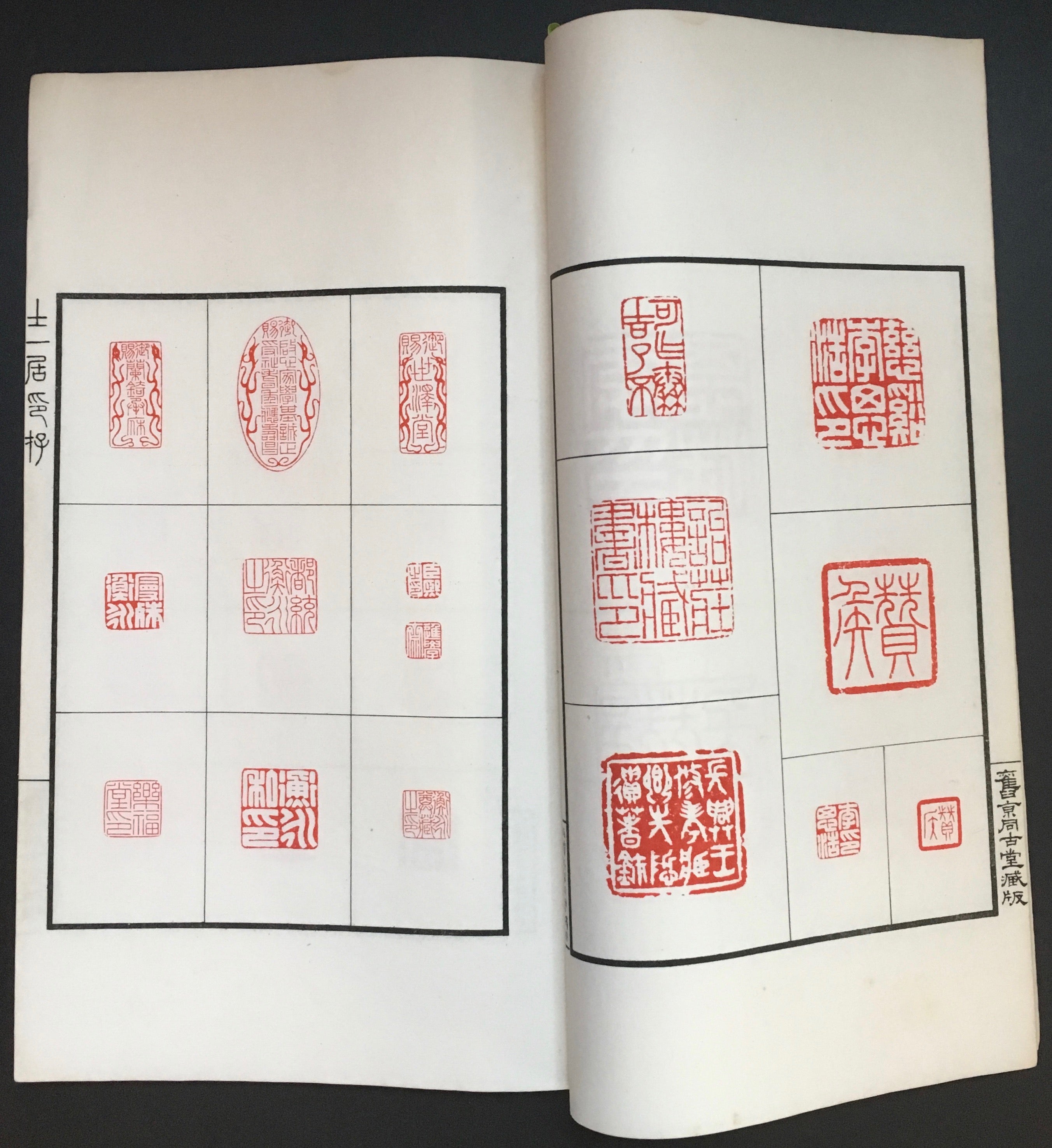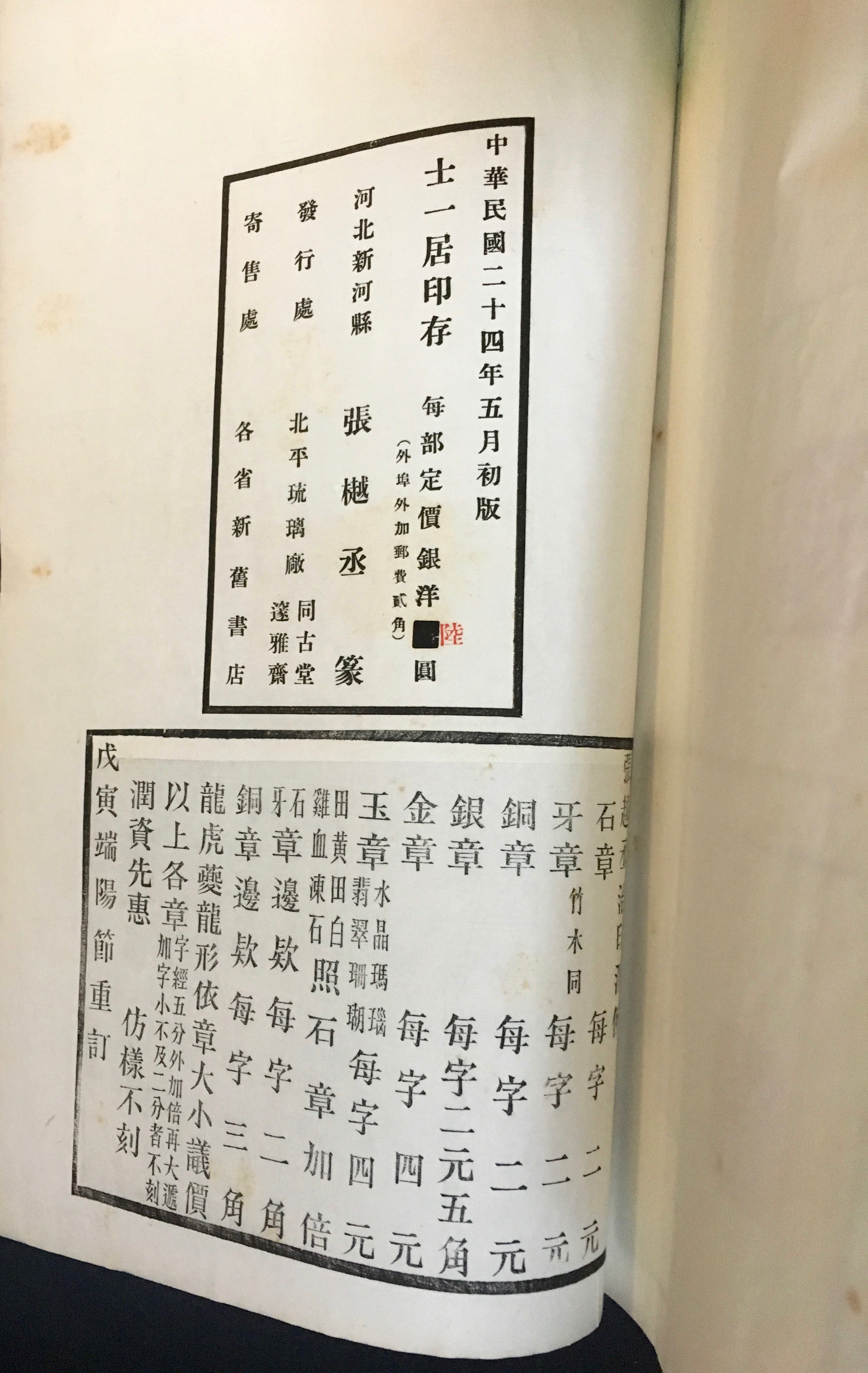 Catalog of Chinese name seals by artist Chang Yüeh-ch'êng. With a foreword in English by the American scholar John Calvin Ferguson, dated April 1935. Approx. 130 pp. Softcover, loosely stitched. Fading and wear to the wrappers, but overall in very good condition. 8.75 x 13 inches (22.3 x 33.5 cm).