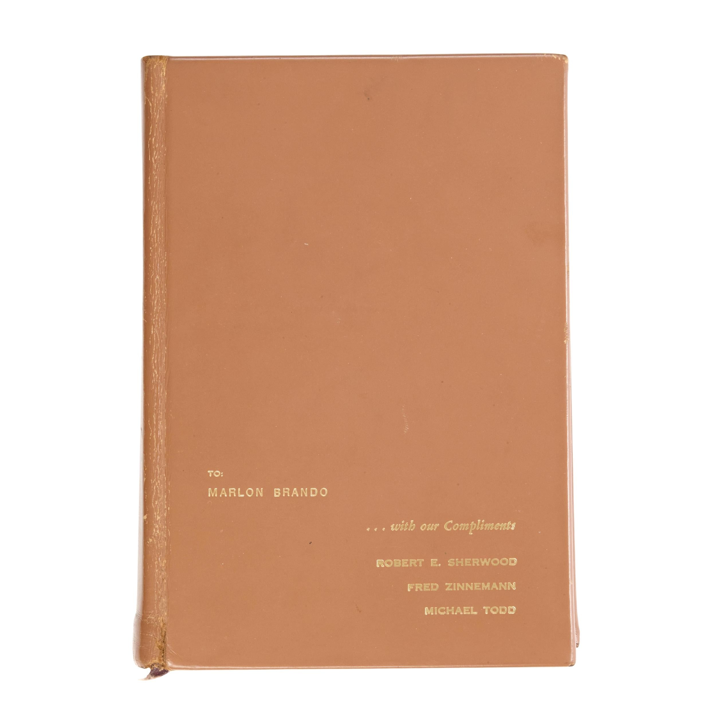 Presentation copy of Tolstoy's War and Peace prepared for and gifted to Marlon Brando by the producer Michael Todd, director Fred Zinnemann, and playwright Robert E. Sherwood, almost certainly as an overture to offering him a role in their never-made film adaptation of the novel. Brown imitation leather covers gilt-stamped "To / Marlon Brando / ...with our Compliments. / Robert E. Sherwood / Fred Zinnemann / Michael Todd." Sherwood has typed an inscription to a bound-in extra front end paper, "I started reading this book in 1923 and finished it in 1943, when another would-be world conqueror was bogged down and beaten in the Russian winter. There is material here for hundreds of motion pictures; the problem confronting Mike Todd, Fred Zinnemann and me is to determine which is the best and the most faithful to the immortal spirit of Tolstoi. / Robert E. Sherwood." This is the "Inner Sanctum Edition," translated by Louise and Aylmer Maude, with a Foreword by Clifton Fadiman. Published at a time when Moscow and all Russia were threatened by German invaders, this edition provides rich documentation of Napoleon’s 1812 invasion, treating the novel as history rather than literature. Hardcover; lxii, 1361, [9] pages, maps, together with a a reader guide's in rear inner cover paper pocket. Light wear to spine, rear board partially split from spine; overall in fine condition.