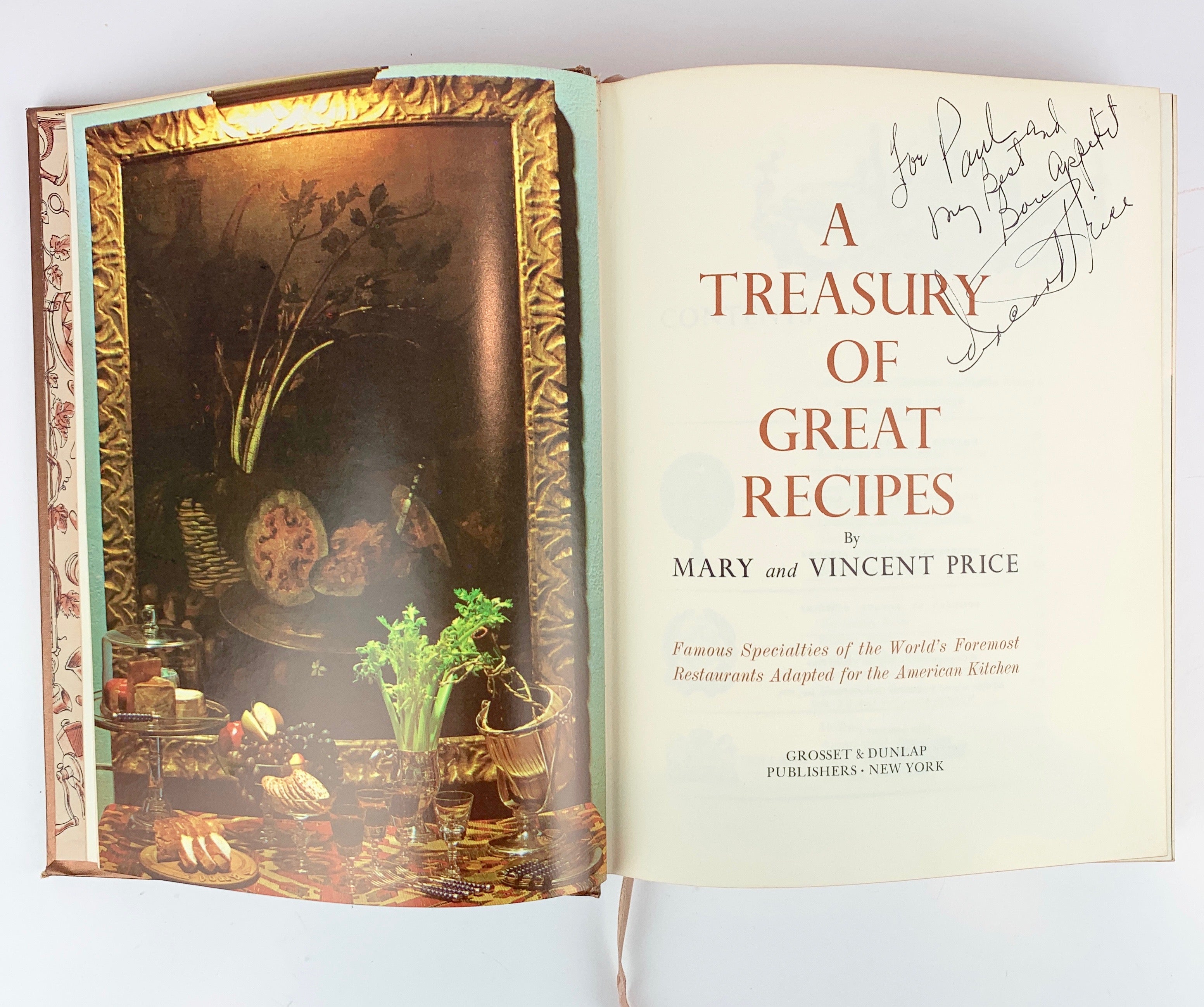 A Treasury of Great Recipes was Price's first cookbook, co-authored with his wife Mary Grant, who was a successful costume designer. Two years later, the couple would publish Mary and Vincent Price present a National Treasury of Cooking, a 5-volume set. In 1971, Price hosted a half-hour cooking show in the UK called Cooking Price-Wise. Throughout his career, Price maintained friendships with gourmet chefs around the world.