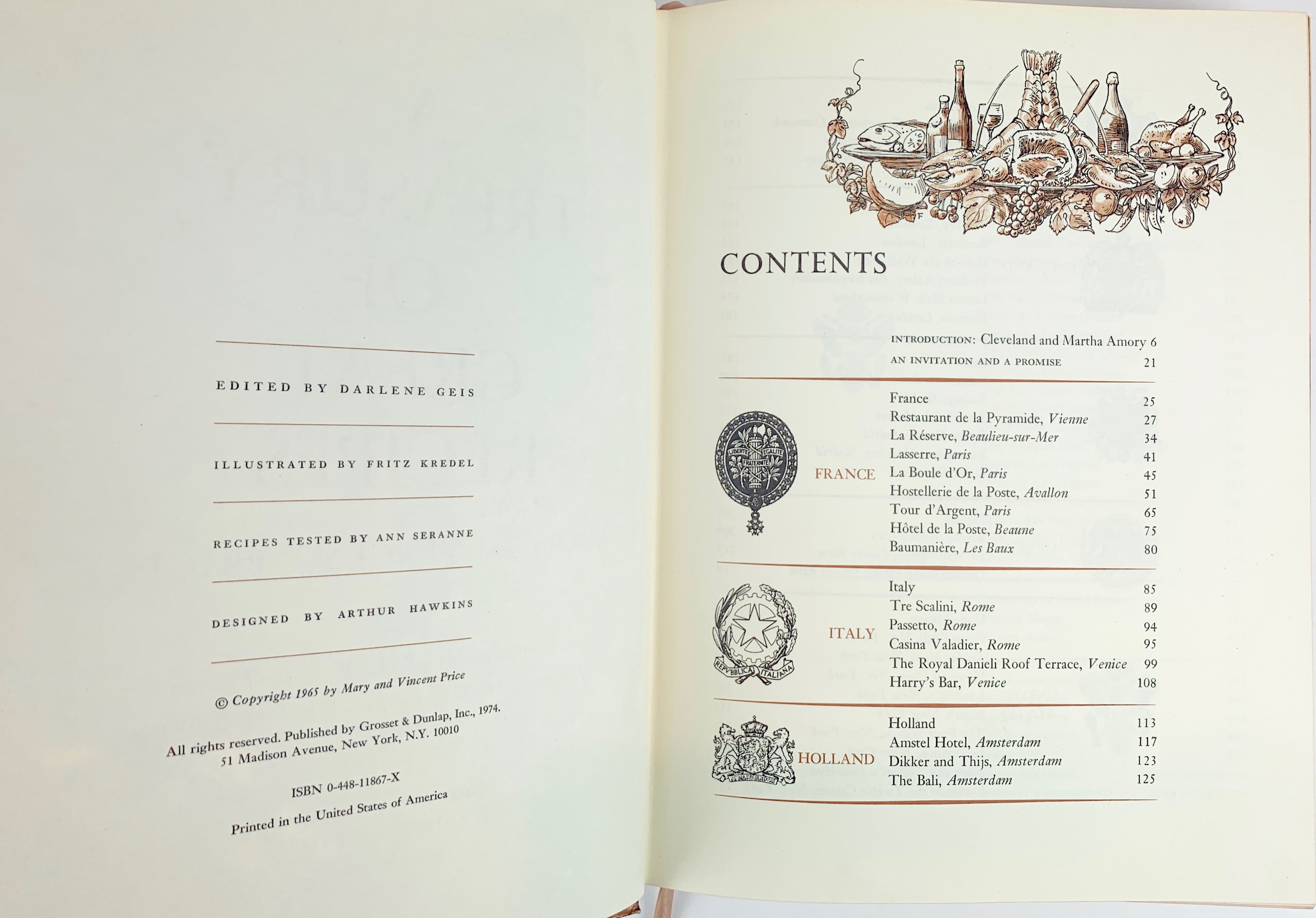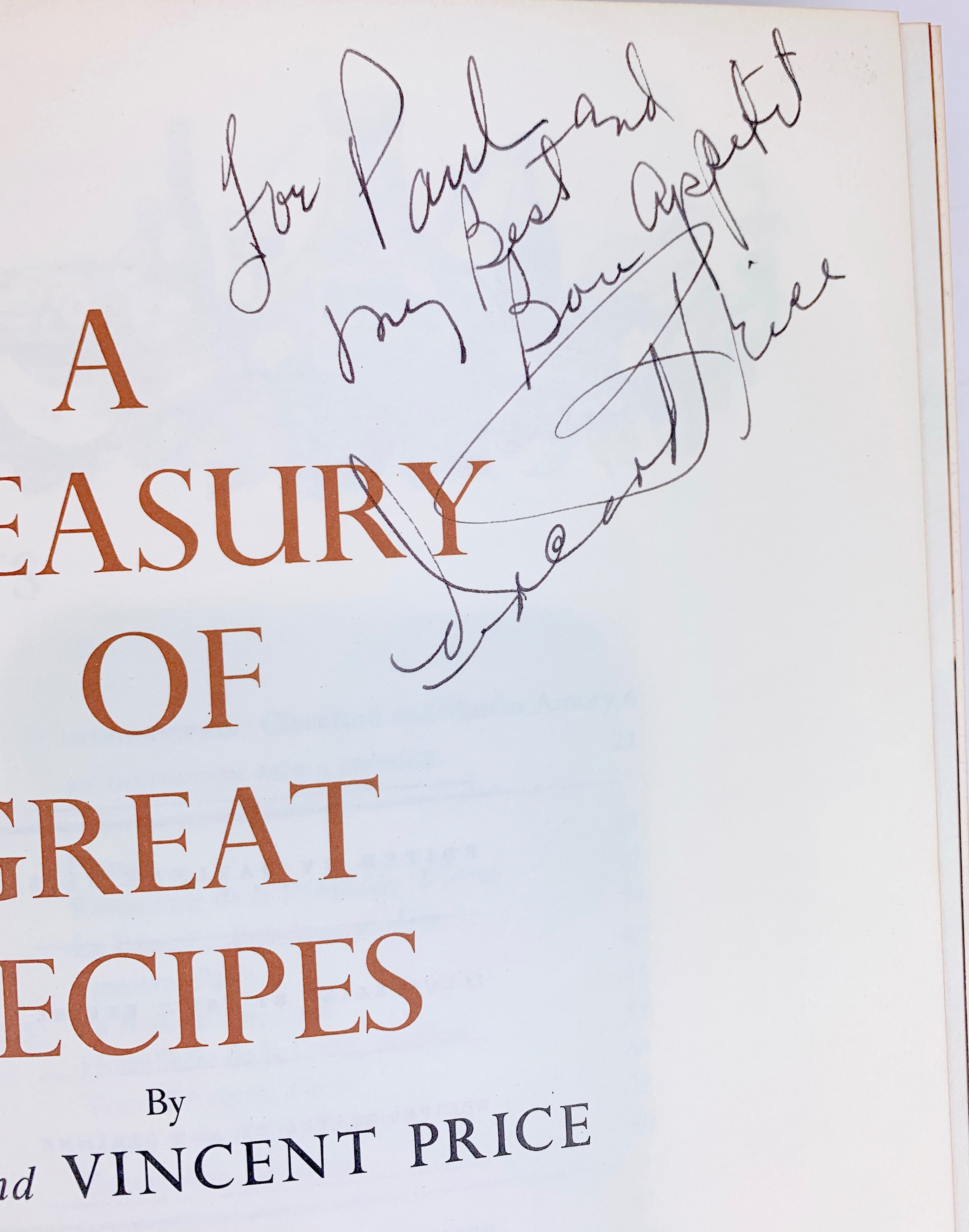 4to. Hardcover. 488 pp. Padded two-toned copper boards, gilt lettering on spine, gilt lettering and decoration on boards; illustrated endpapers; two ribbon place-holders. Illustrated with sumptuous color plates and restaurant menus. One of the most desirable of celebrity cookbooks, this copy has been signed and inscribed by the beloved actor and renowned gourmand, "For Paul / My Best and Bon Appetit / Vincent Price" to the title page. One-inch tear to silk ribbon place holder, else in fine condition.