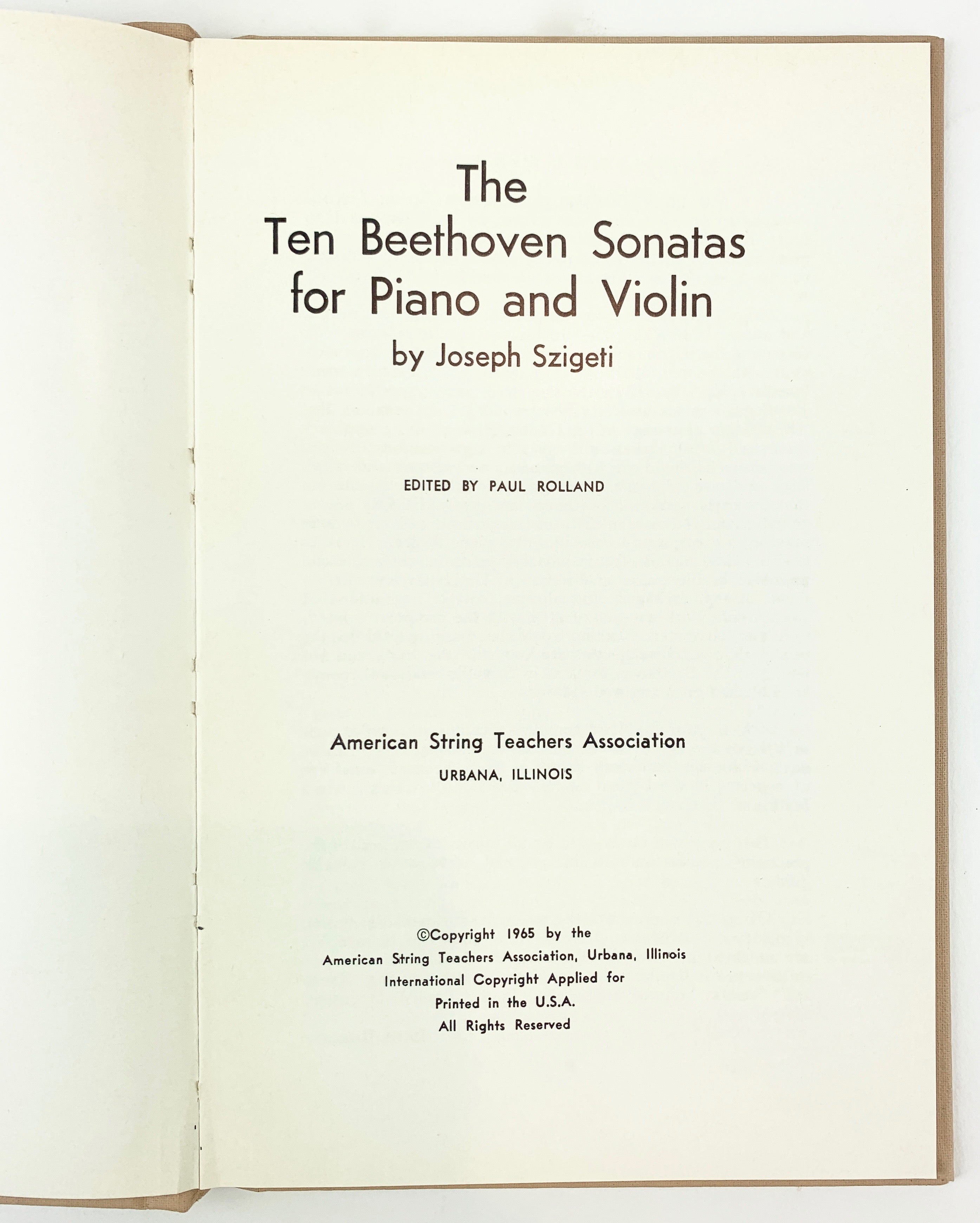 Szigeti, Joseph. (1892–1973) [Beethoven, Ludwig van. (1770–1827)] [Ed. Paul Rolland]. The Ten Beethoven Sonatas. Urbana, Illinois: American String Teachers Association. 1965. First edition. Hardcover, no dj (as issued). 8vo. 55 pp. 1968 gift inscription to inside front board, else clean throughout. A solid and attractive copy of a scarce book in which the great violinist shares his views and ideas on the Piano-Violin Sonatas of Beethoven. Rather than dissecting the music, Szigeti's analysis discusses the music in terms of human feelings and values, and offers an exceptional insight into Beethoven's life as it relates to the sonatas.