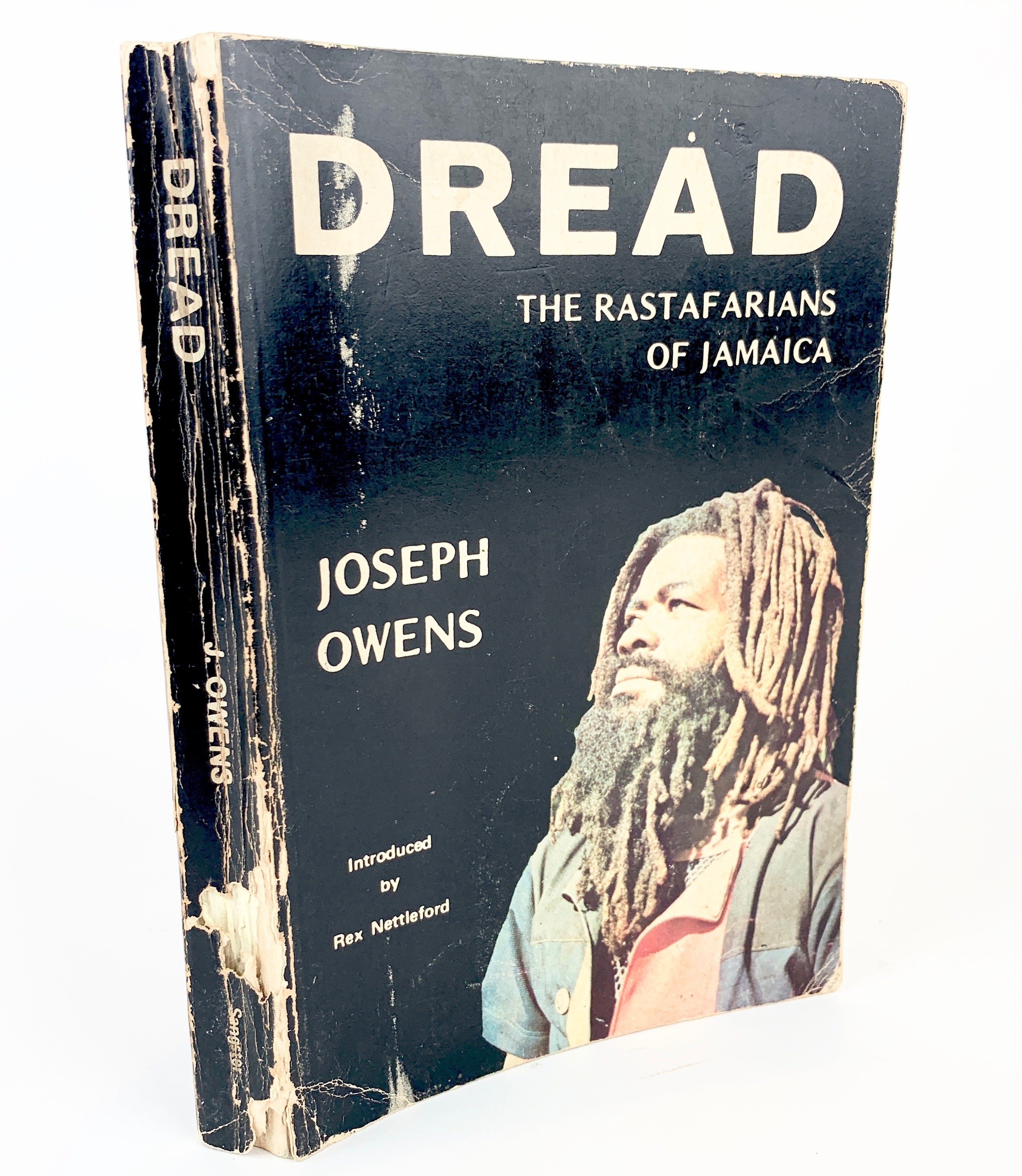 [Jamaica] Owens, Joseph. . Dread. The Rastafarians of Jamaica. Kingston, Jamaica: Sangster. 1976. First (presumed). 8vo. Softcover, photographically illustrated front cover. [i - xix] 1 - 282 pp. With an introduction by Rex Nettleford. A worn copy, with a small bite to the spine, scattered wear and creases to spine and around the edges, ownership signature to inside front cover, scattered light foxing to early pages, overall solid and otherwise clean internally.