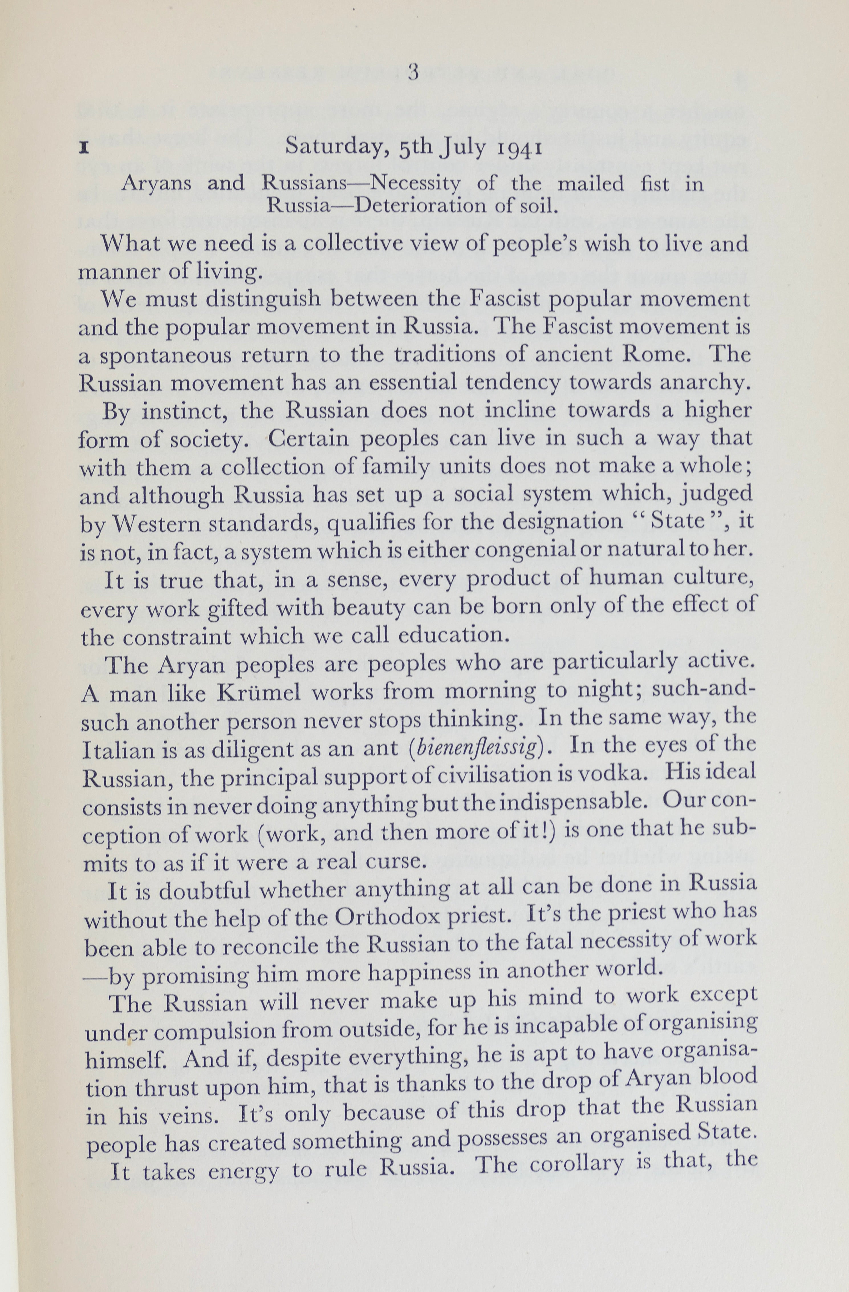 8to. 746 pp. Hardcover, dust jacket not included. Series of Hitler's monologues transcribed during World War II from the years 1941-1944. His words were recorded at the request of Martin Bormann, a Nazi party official, presumably with the plan of publishing them once the war had ended. Spine detached from back joint, otherwise a good copy of this scarce volume.