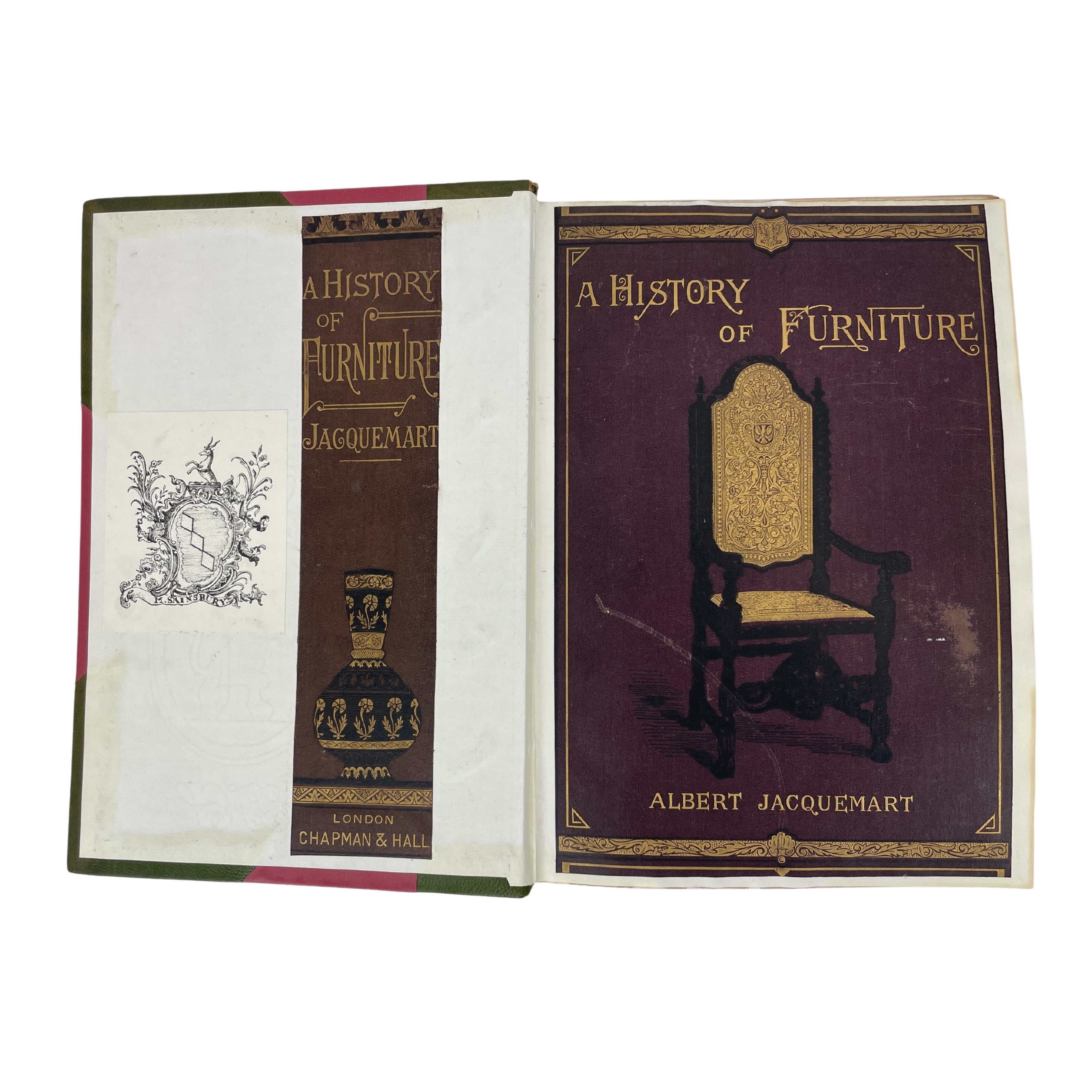 [Furniture & Design] Jacquemart, Albert. (1808–1875). A History of Furniture, Translated from the French. London: Chapman & Hall. 1878. First. xvii, 470 pages; numerous illustrations. Olive half calf with gilt lettering and raised bands. 7.5 x 10.25 inches (19.5 x 26 cm). Original cloth decorated cover and spine nicely mounted to inner front board and an added front flyleaf. Half title and title with paper repairs around edges or gutter, a few pages with small tears, one page with old tape reparis, but in very good condition overall.