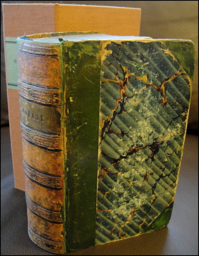 [Mozart, Wolfgang Amadeus. (1756–1791)] Nissen, Georg Nicolaus von. (1761–1826). Biographie W. A. Mozart's. Nach Originalbriefen, Sammlungen alles über ihn Geschriebenen, mit vielen neuen Beylagen, Steindrücken, Musikblättern und einem Facsimile. Leipzig: G. Senf. [1849]. Second Edition. Zweite Wohlfeile Ausgabe [second cheap edition]. 2 parts in 1 vol. 8vo, contemp. 3/4 green calf & marbled bds. & edges; spine faded, scuffed, extremities rubbed. Frontis. portrait, 8 plates (2 fold.), 9 fold. leaves of music. Former owner's ink signature at head of title. Scattered light foxing. In custom brown cloth clamshell box.