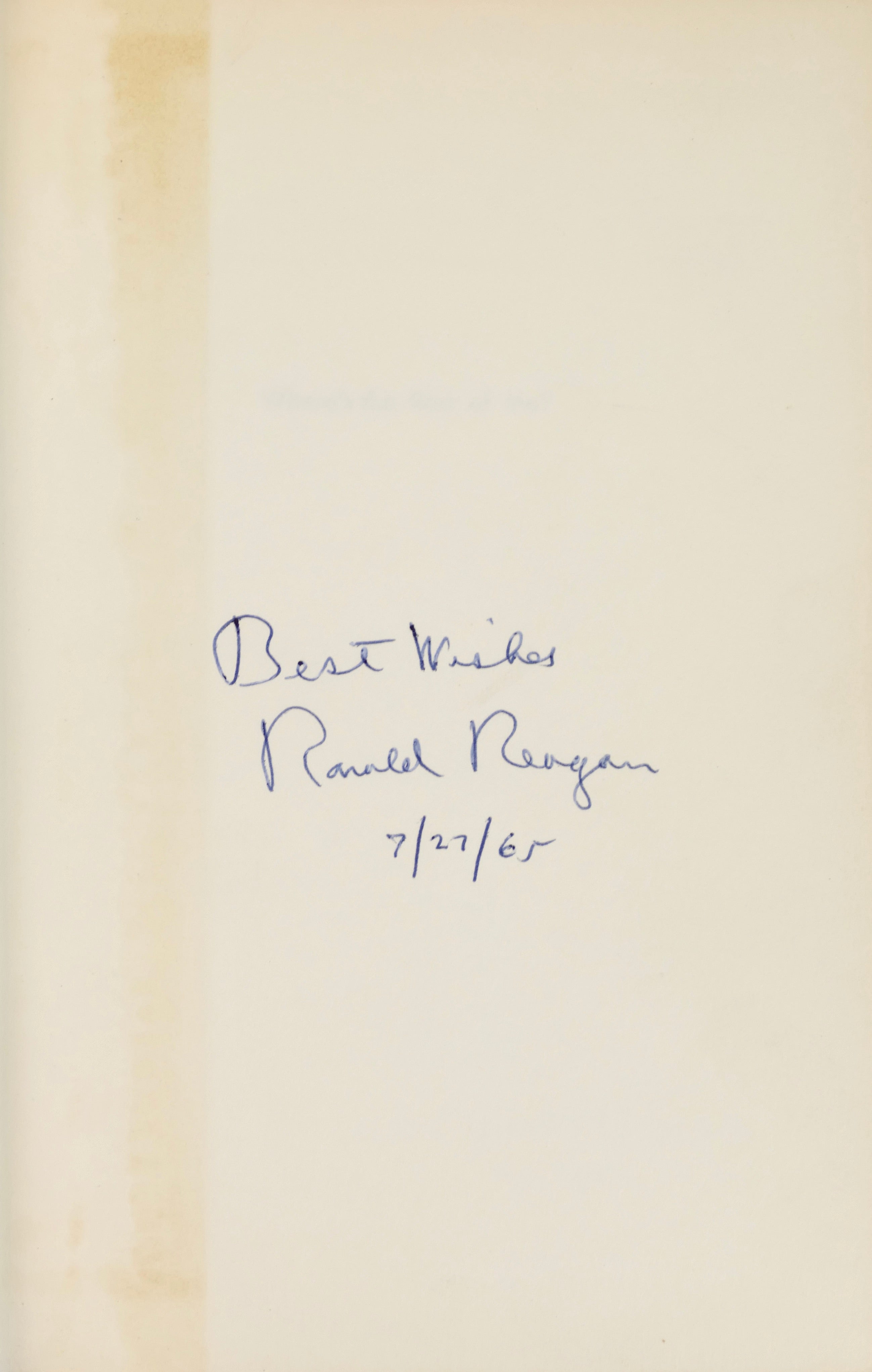 Reagan released his autobiography in 1965 as he ramped up his campaigning for an as-yet officially unannounced candidacy for the California governorship Republican primary. At the time of the present signing, he was surging in the polls, though it was still over a year until the election. We are aware of at least 4 other copies of this volume signed on the same date, which must have been a campaign event.