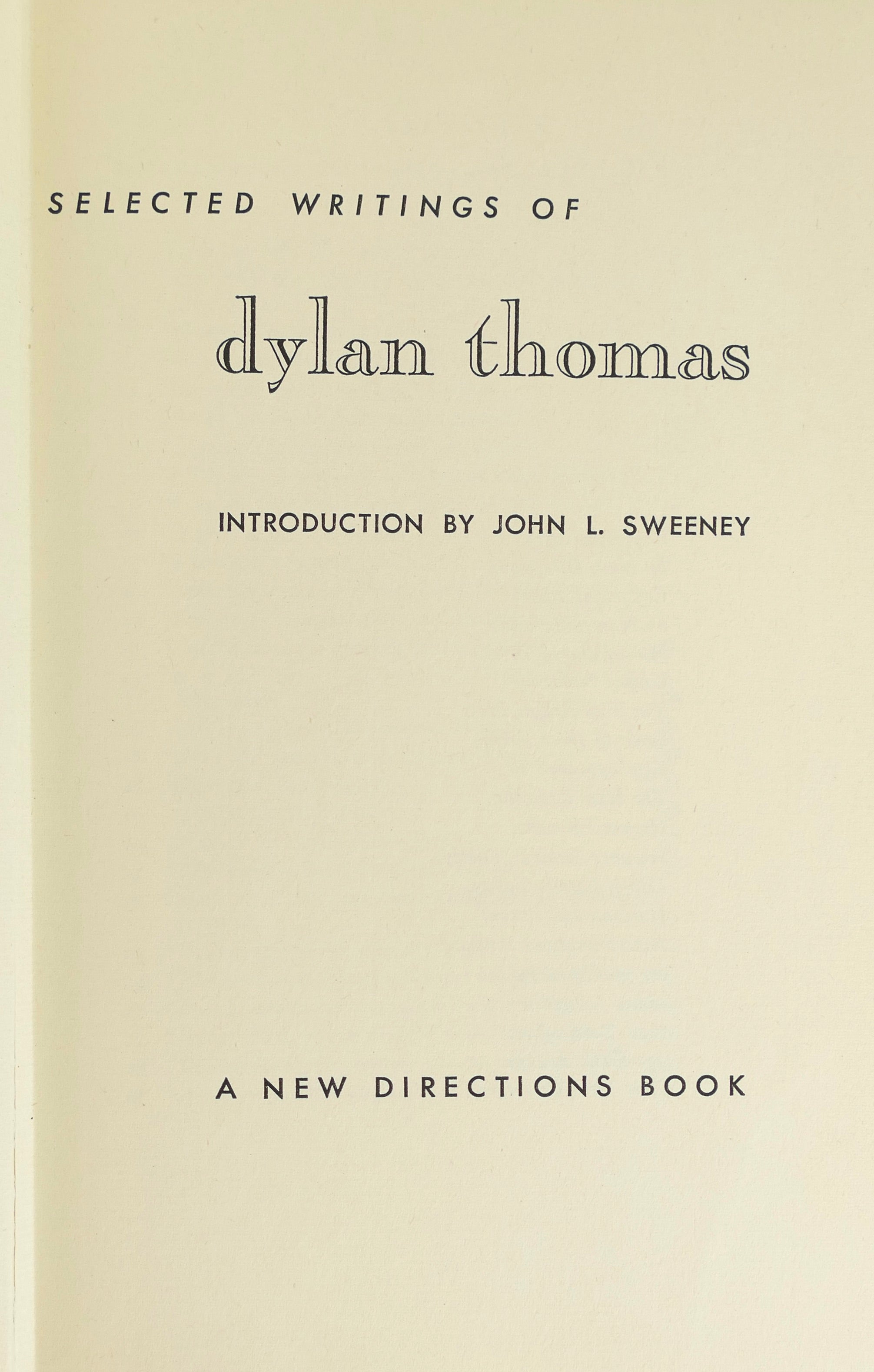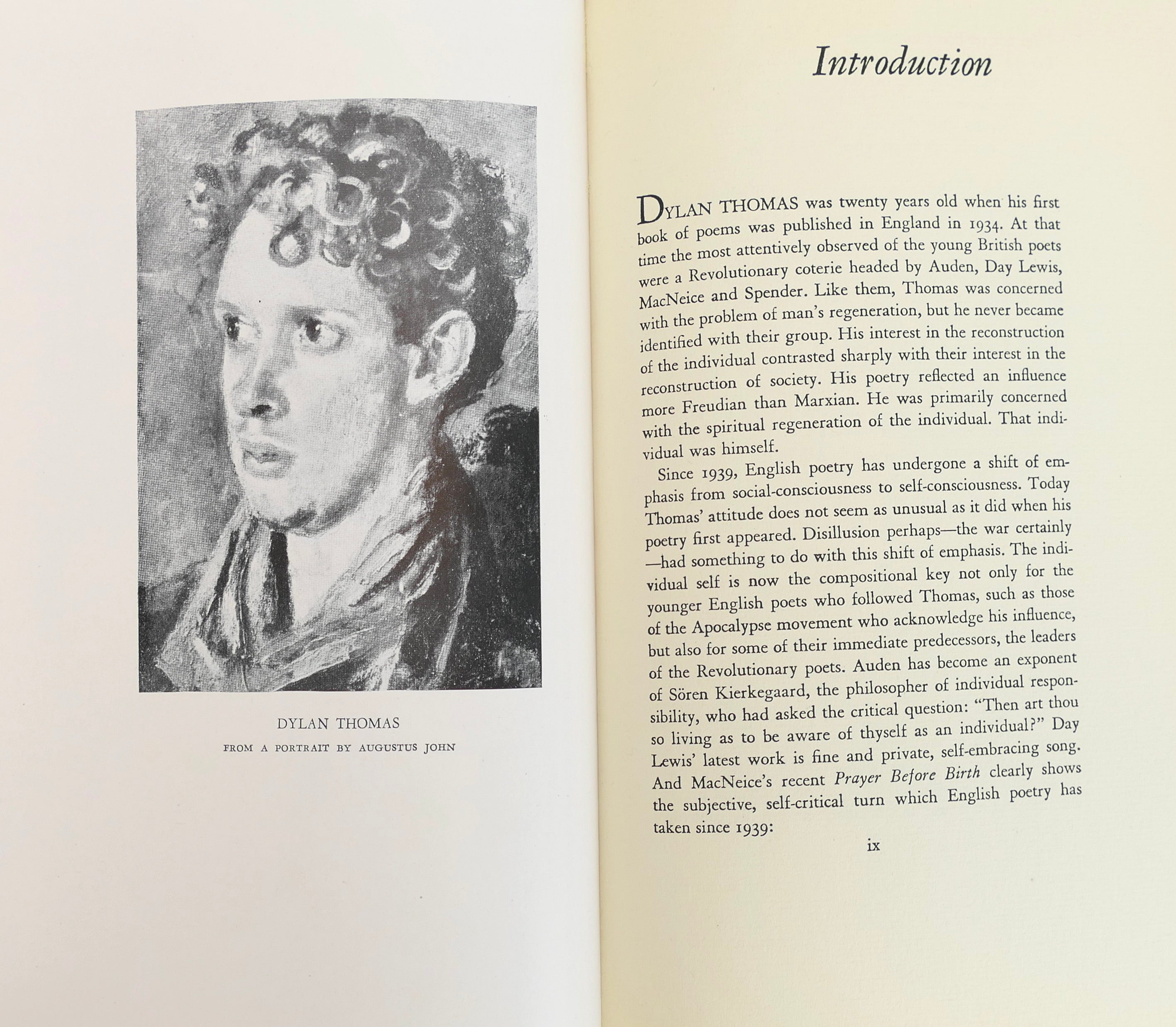 Hardcover. 8vo. 184 pp. With the neat, diminutive signature of the the celebrated Welsh poet on the front free end paper "Dylan Thomas" in black ink. Includes frontis portrait of the poet by Augustus John opposite p. ix. Likely second issue with publisher's address of "333 Sixth Avenue" on copyright page instead of "500 Fifth Avenue," as New Directions moved to 333 Sixth Avenue after 1946 and by 1953. Dust jacket with "333 Sixth Avenue" on bottom of rear panel and no "Lowry" on lower right front panel. Bound in publisher's rose cloth with gilt spine letters blocked in black, in a very good dust jacket with light edge wear and small tear to upper spine flap fold. Rolph B11. Maud, 12.