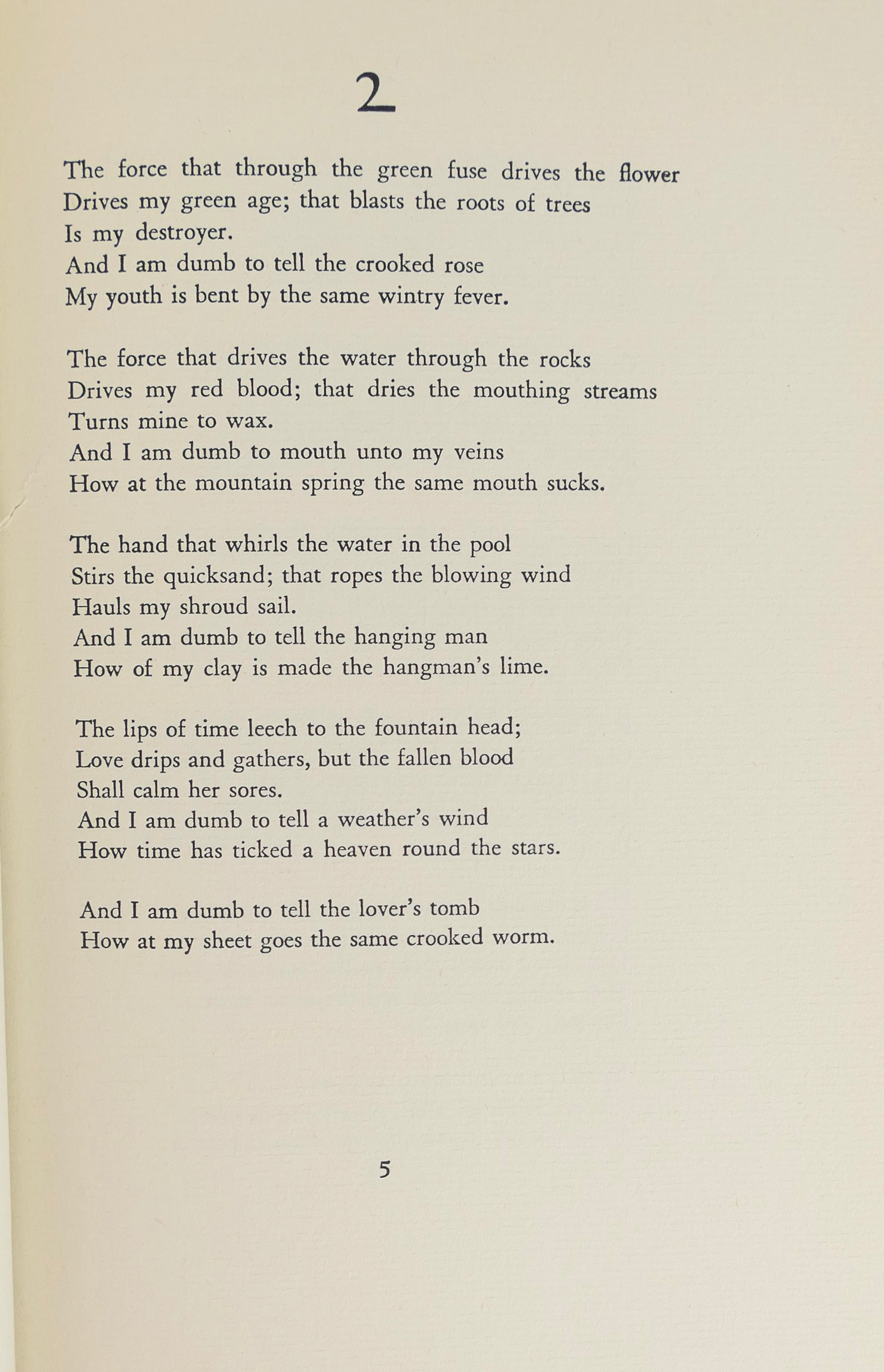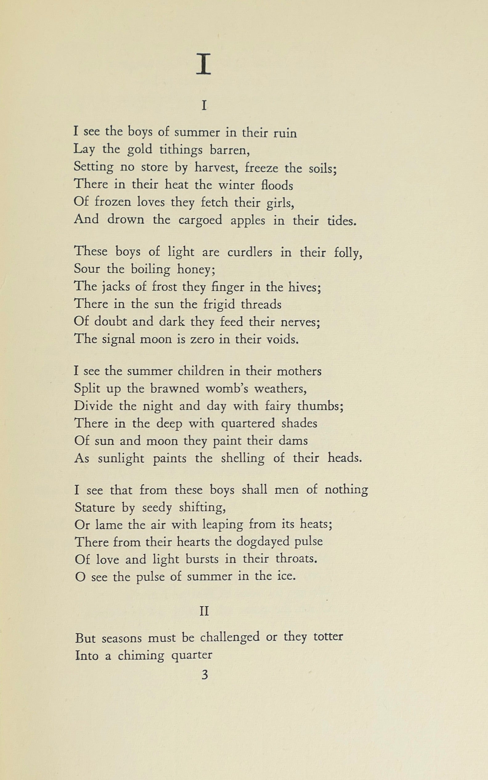 Among the poems included in Selected Writings are "I see the boys of summer in their ruin," "Fern Hill," "A Refusal to Mourn the Death, by Fire, of a Child in London," and "In My Craft or Sullen Art." Also included are four short stories and two chapters excerpted from Thomas' autobiographical Portrait of the Artist as a Young Dog.