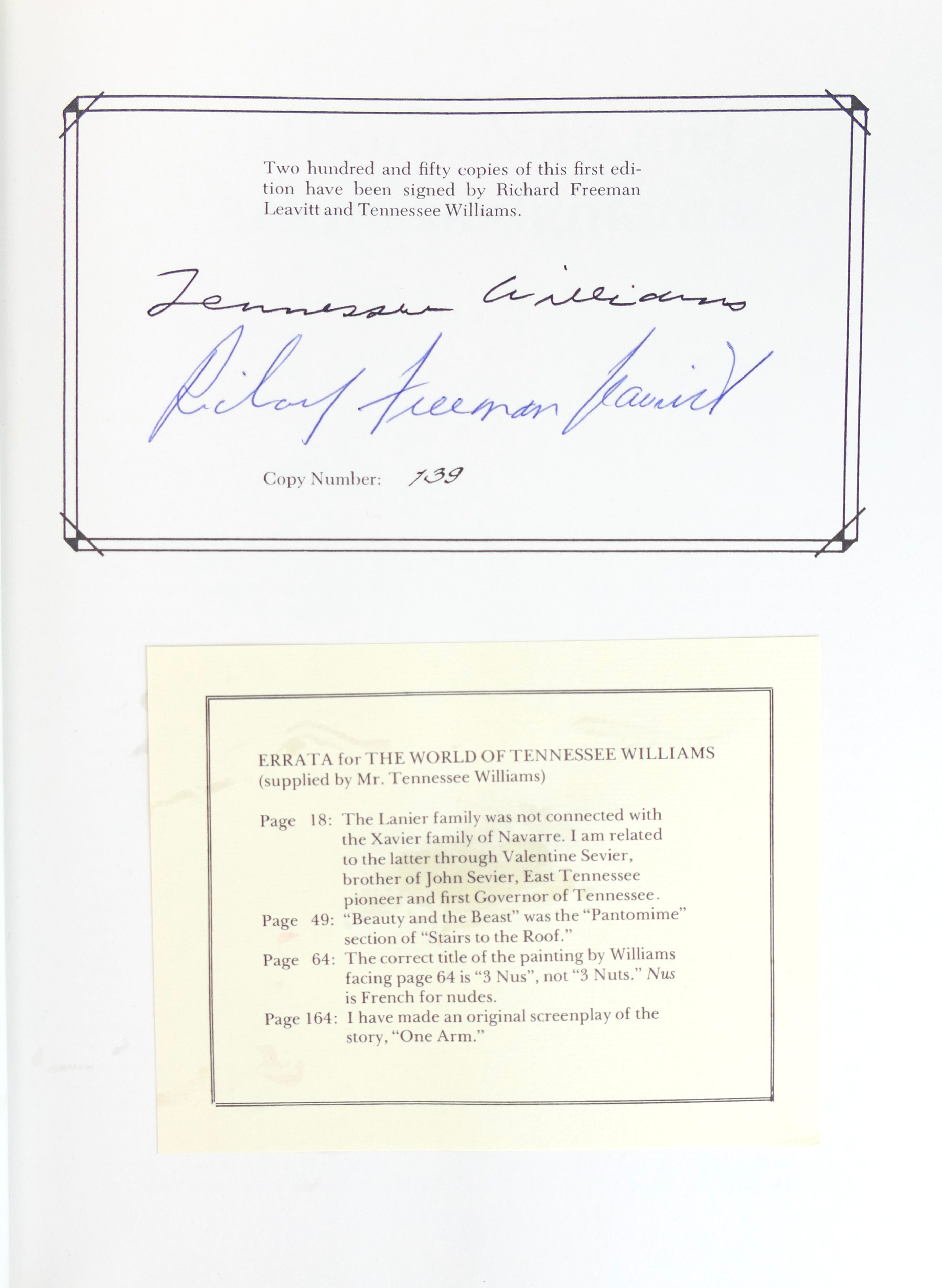 4to. 168 pp. Special limited first edition signed by Williams and Leavitt, numbered 139 out of 250. Errata supplied by Williams pasted on fly leaf. Large, tan cloth-covered boards lettered in gilt on spine. Fine in near fine dust jacket with slip case. Includes an introduction by Williams. An attempt to "capture pictorially the man and the playwright" (from the jacket flap). Profusely illustrated with photographs, letters, rehearsal notes, manuscript drafts, posters, etc., many of which are previously unpublished. Measures 12.25 x 9.25 inches.