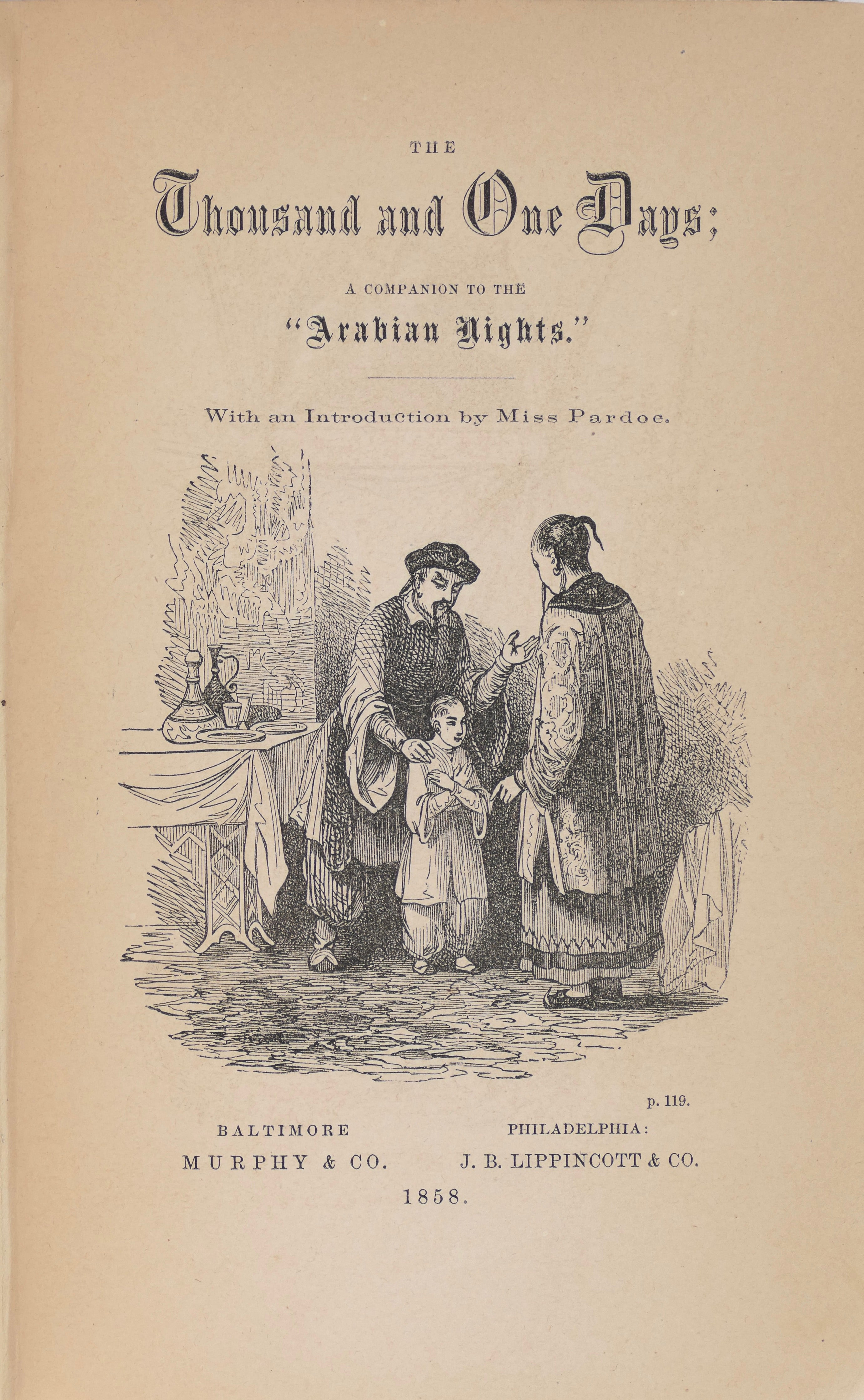 [Anonymous] Pardoe, Julia. (1804 – 1862). "The Thousand And One Days: A Companion to the Arabian nights" - First American Edition. Baltimore / Philadelphia: Murphy & Co. / J. B. Lippincott & Co.. 1858. First American Edition.