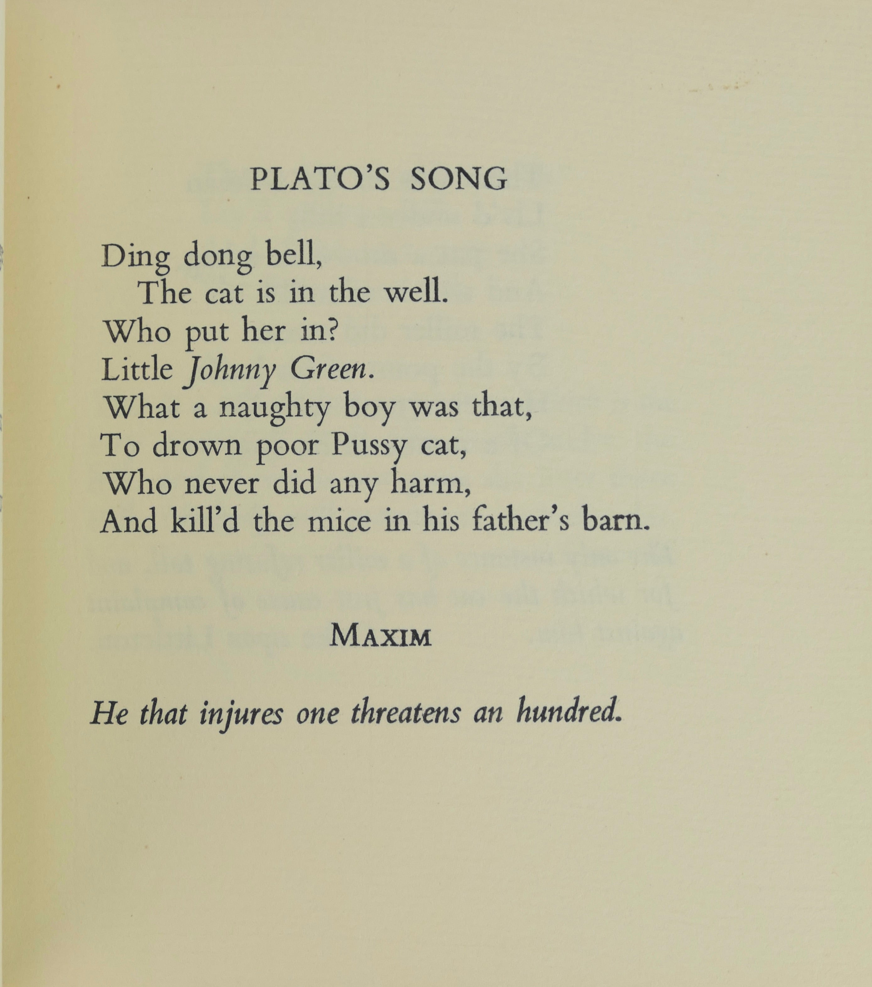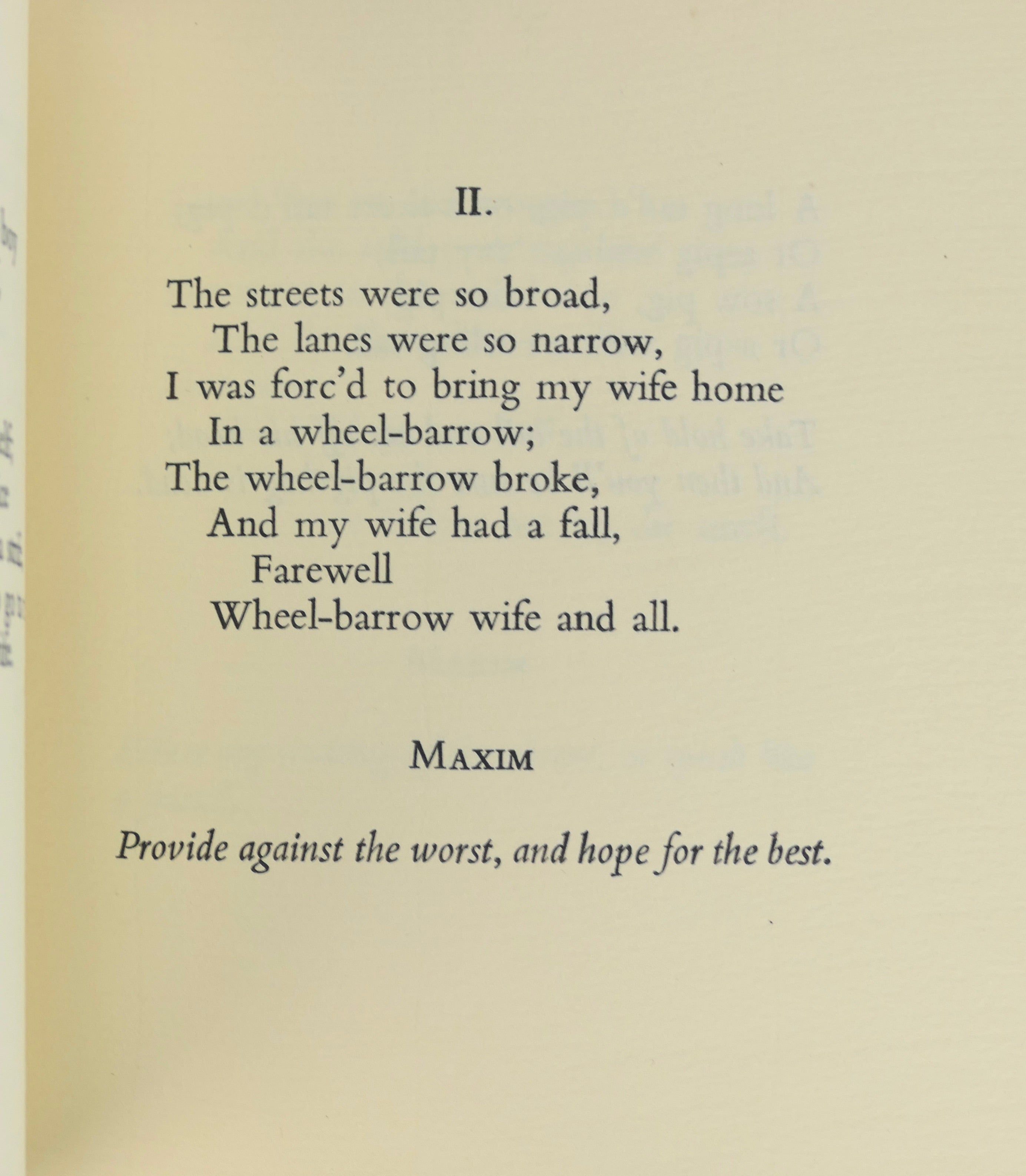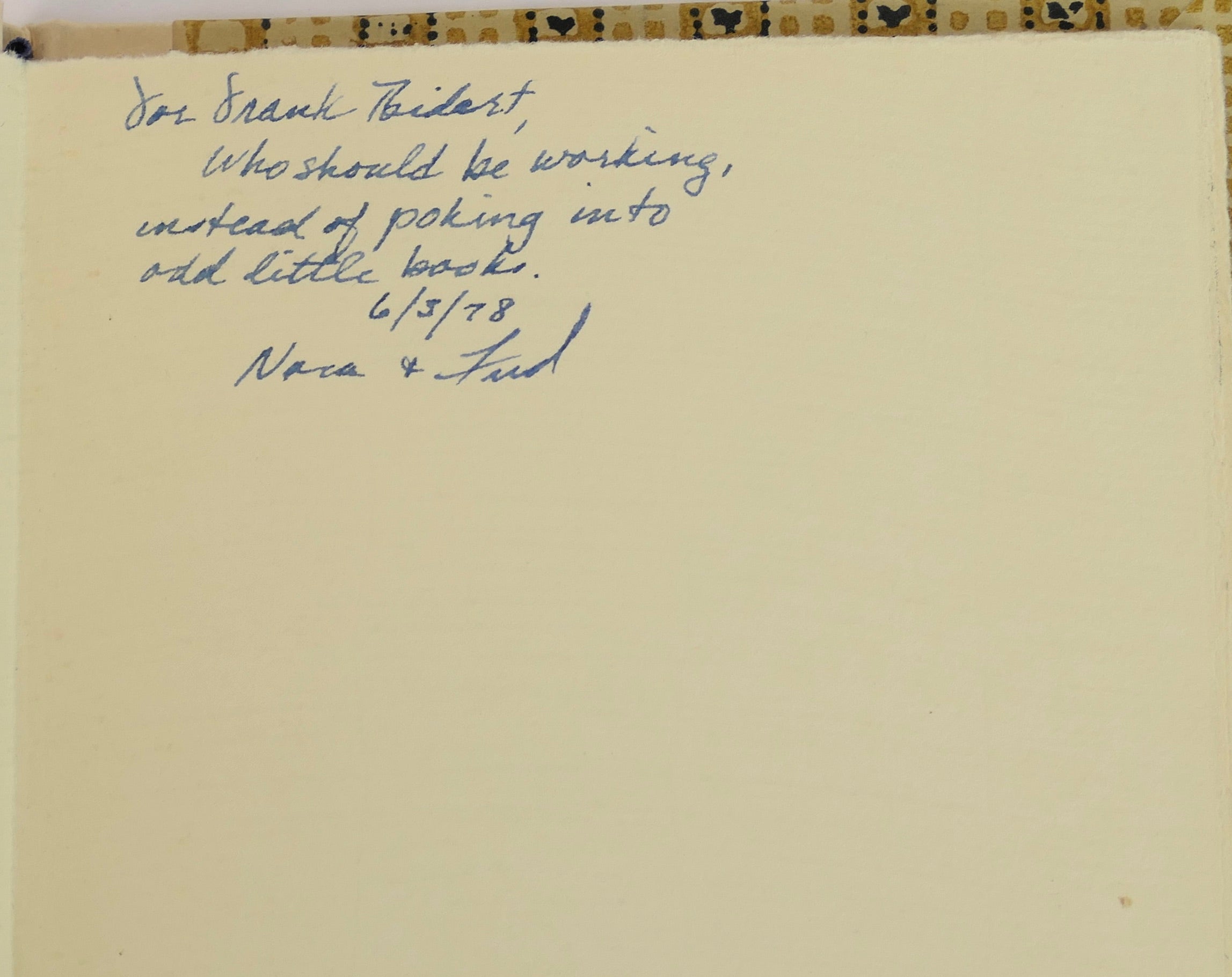 Hardcover. 16mo. Title, hand-colored; [24] pp; limitation. Inscribed on the ffe "For Frank Bidart, Who should be working, instead of poking into odd little books. 6/3/78 / Nora + Fred." Limitation page reads in full "These rhymes have been selected from Mother Goose's Melody: or Sonnets for the Cradle, originally compiled by the 18th century publisher, John Newberry, but not published until after his death, first appearing in 1781. The 'maxims' are sometimes attributed to novelist Oliver Goldsmith. Printed by F.W. Hegeman [Fred] and N.K. Kelley [Nora] in an edition of fifty copies. The typeface is Bembo, the paper mouldmade Frankfurt Rough. Printed May, 1978." In publisher's patterned paper boards, very fine.