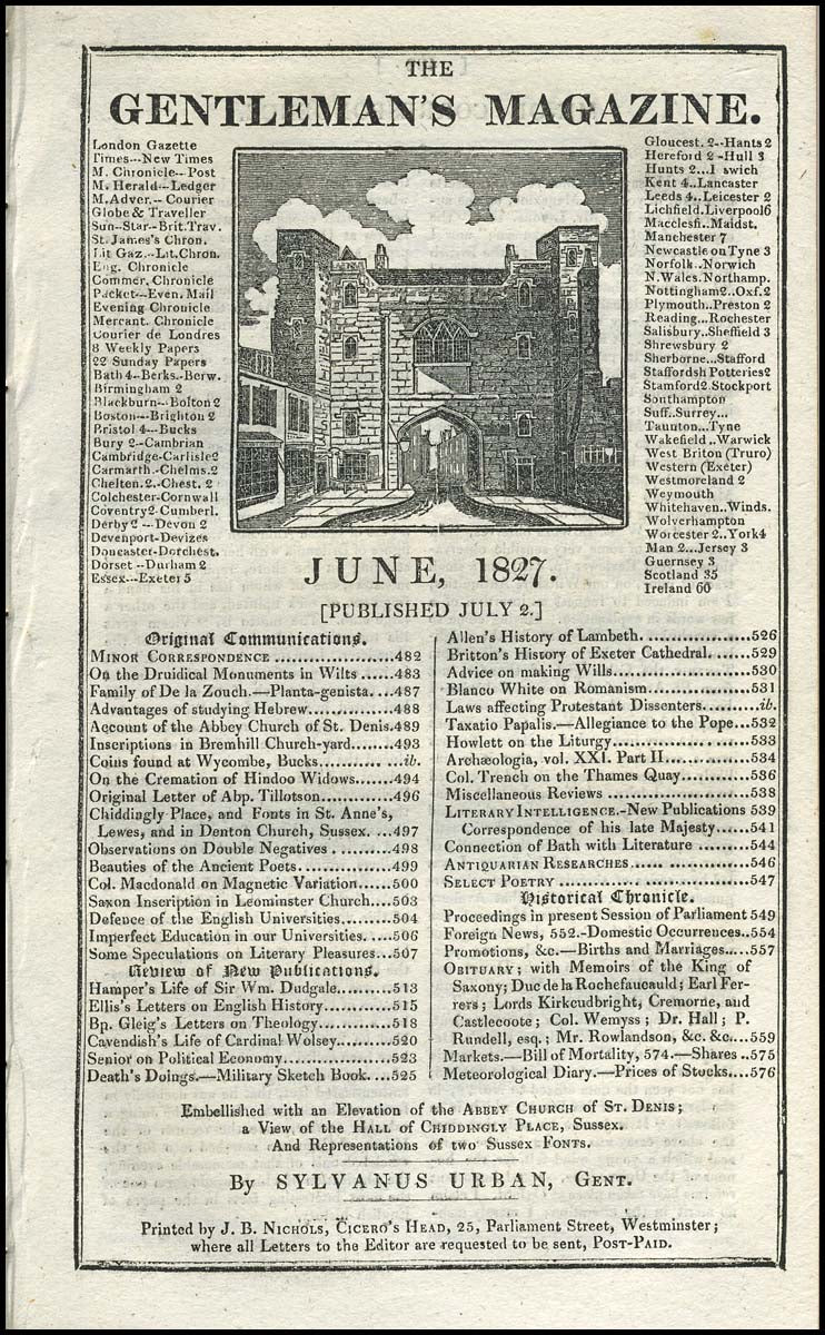 [Literature & Art] [Rowlandson, Thomas. (1756–1827)] . 1827 Gentleman's Magazine with Rolandson Obituary. The Gentleman's Magazine, and Historical Chronicle. For June, 1827.