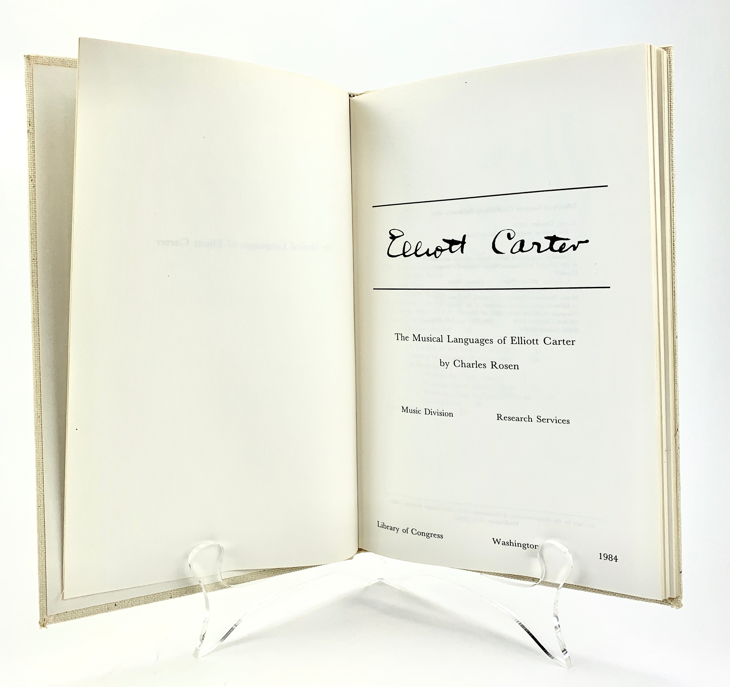 Carter, Elliott. (1908–2012) [Knussen, Oliver. (1952–2018)]. "The Musical Languages of Elliott Carter" — Signed Presentation Copy. Washington: Library of Congress. 1984. First. Signed Presentation Copy from the great American composer to the great British composer Oliver Knussen and his wife: "For Sue and Ollie / affectionately / Elliott / N.Y. / April 25, 1985." Hardcover. 87 pp. Toning to cover, else in fine condition.