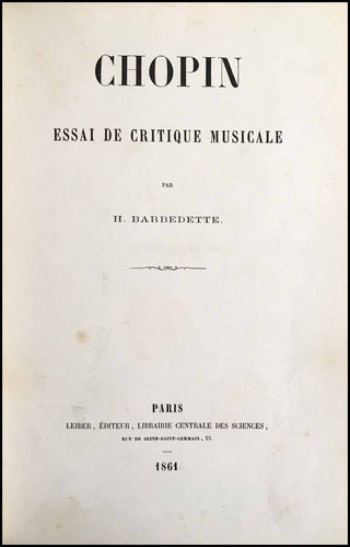 [Chopin, Frédéric. (1810–1849)] Barbedette, Hippolyte. (1827–1901) Chopin. Essai de critique musicale - FIRST EDITION OF ONE OF THE EARLIEST BOOKS ON CHOPIN