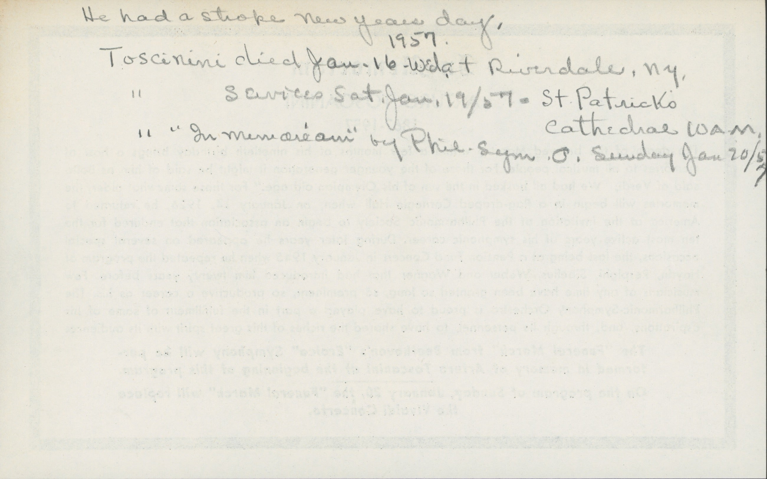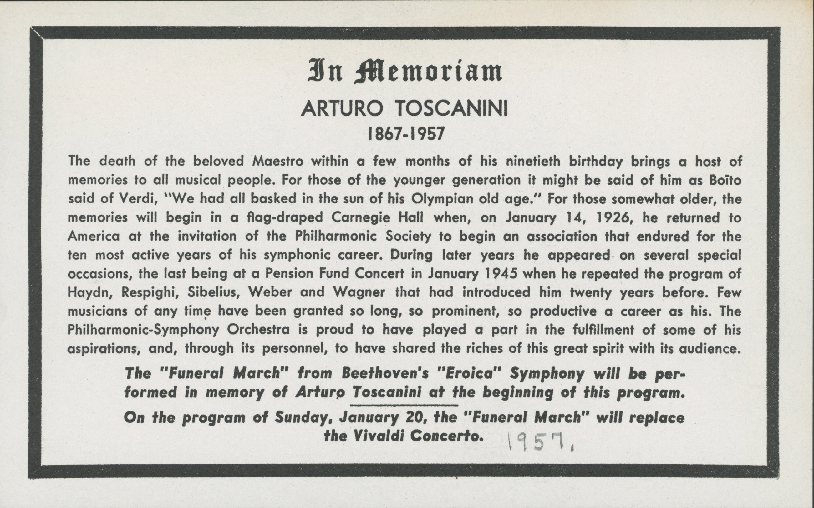 "In Memoriam / Arturo Toscanini / 1867–1957 / The death of the beloved Maestro within a few months of his ninetieth birthday brings a host of memories to all musical people. For those of the younger generation it might be said of him as Boïto said of Verdi, "We had all basked in the sun of his Olympian old age." For those somewhat older, the memories will begin in a flag-draped Carnegie Hall when, on January 14, 1926, he returned to America at the invitation of the Philharmonic Society to begin an association that endured for the ten most active years of his career. During later years he appeared on several special occasions, the last being at a Pension Fund Concert in January 1945 when he repeated the program of Haydn, Respighi, Sibelius, Weber and Wagner that introduced him twenty years before. Few musicians at any time have been granted so long, so prominent, so productive a career as his. The Philharmonic-Symphony Orchestra is proud to have played a part in the fulfillment of some of his aspirations, and, through its personnel, to have shared the riches of this great spirit with its audience. / The 'Funeral March' from Beethoven's 'Eroica' Symphony will be performed in memory of Arturo Toscanini at the beginning of this program. / On the program of Sunday, January 20, the 'Funeral March' will replace the Vivaldi Concerto."
