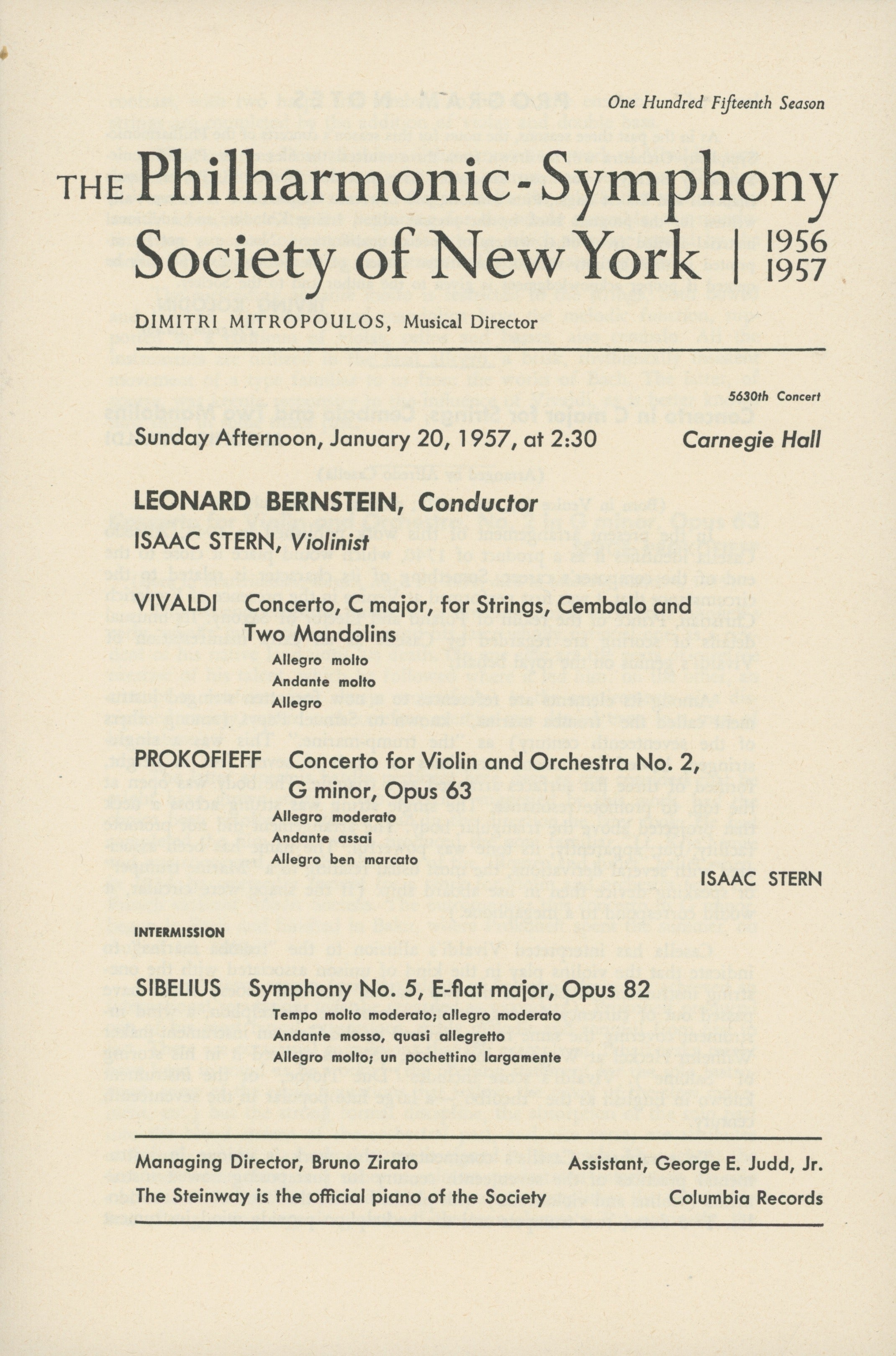 The program, from a performance on Sunday, January 20, 1957 conducted by Leonard Bernstein and featuring Isaac Stern as soloist, lists pieces by Vivaldi, Prokofiev, and Sibelius. In fine condition. 6 x 9 inches (15.2 x 22.9 cm.). An accompanying insert reads: