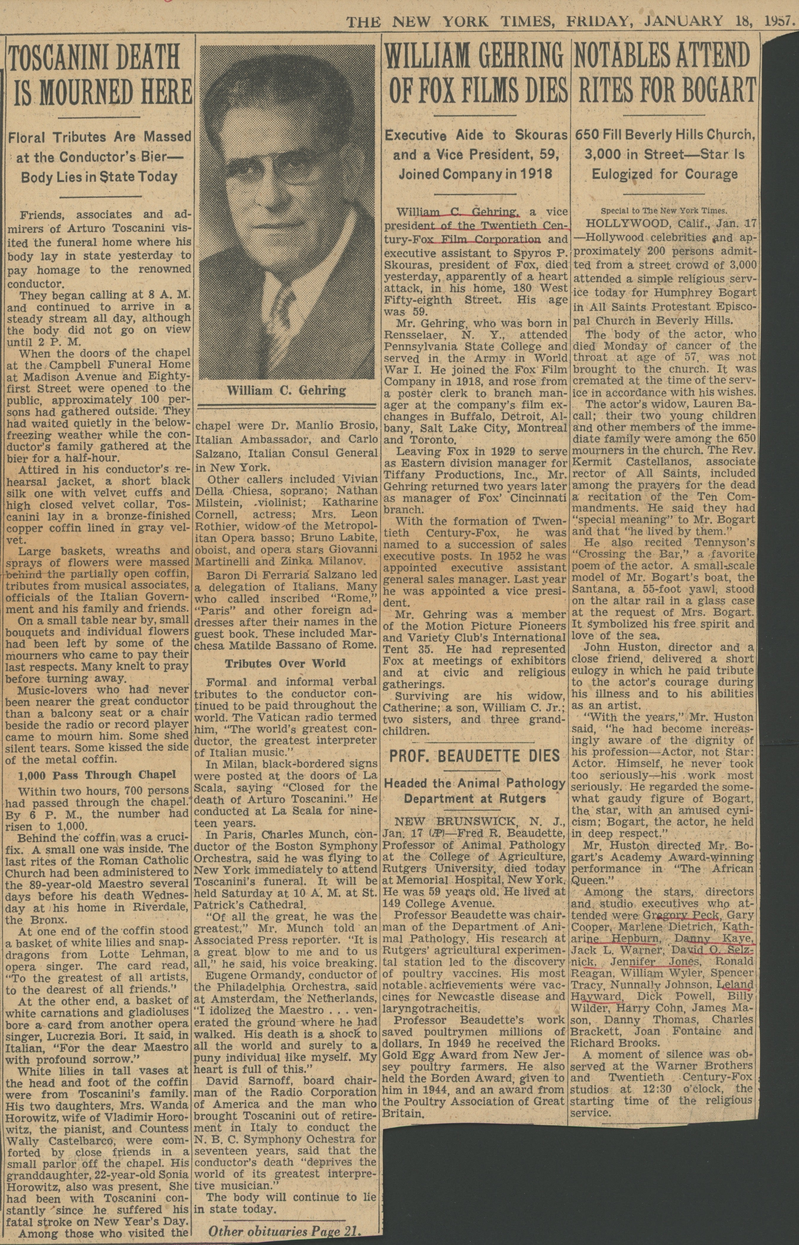 The newspaper article, clipped from the Friday, January 18, 1957 edition of the Times, reads in part "TOSCANINI DEATH IS MOURNED HERE / Floral Tributes Are Massed at the Conductor's Bier—Body Lies in State Today...Attired in his conductor's rehearsal jacket, a short black silk one with velvet cuffs and high closed velvet collar, Toscanini lay in a bronze-finished copper coffin lined in gray velvet." Inch-long split along horizontal fold, irregularly trimmed, else in fine condition. Approx. 7 x 11 inches (17.8 x 27.9 cm.).