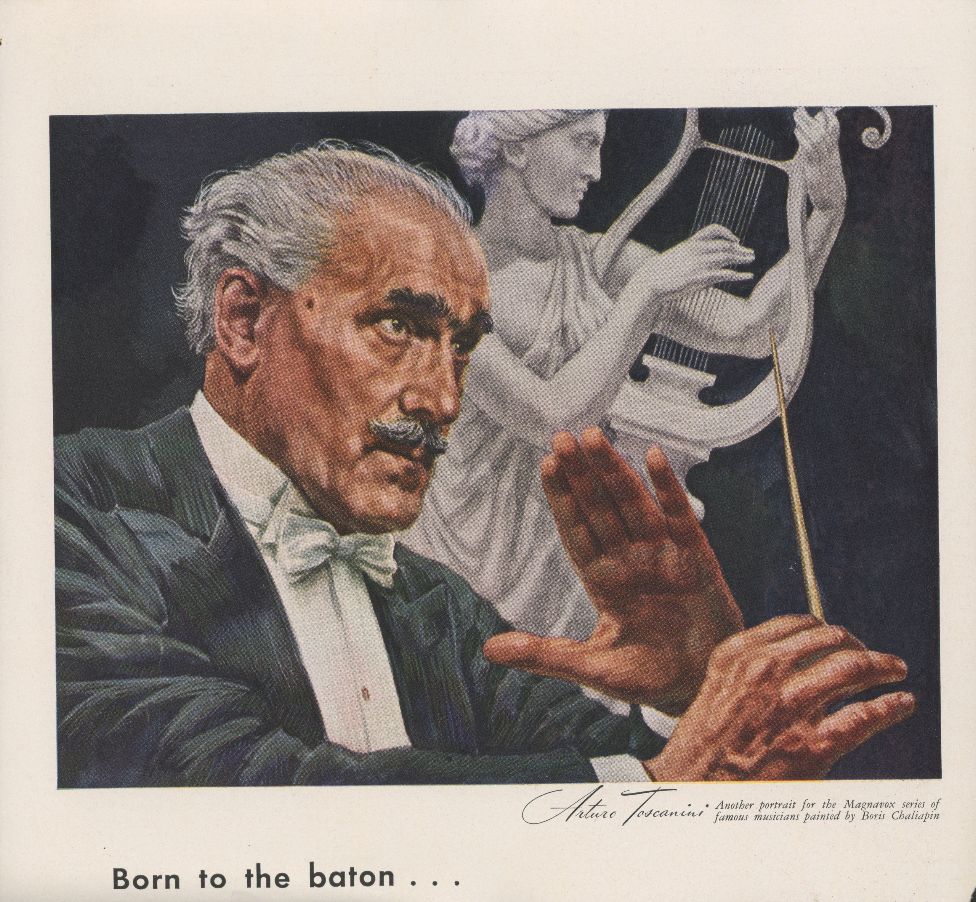 The color illustration, clipped from an unknown publication, shows Toscanini with baton in hand, standing in front of a statue with a lyre. A printed caption to the lower margin reads "Born to the baton... / Arturo Toscanini / Another portrait for the Magnavox series of famous musicians painted by Boris Chaliapin." Irregularly trimmed with slight tear to lower right corner, else in fine condition. 9.25 x 8.5 inches (23.5 x 21.6 cm.).