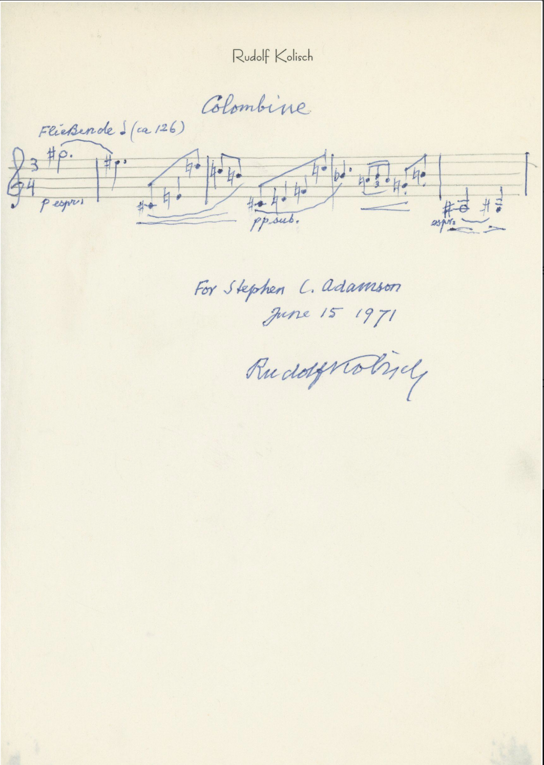 Very rare AMQS, penned on the violinist's printed letterhead, in blue ink, titled "Columbine" and marked "fließende [flowing] [quarter note] (ca 126)," the opening five measures of the violin part, signed and inscribed "Rudolf Kolisch" and dated "June 15, 1971." 10.5 x 7 inches, 27 x 19 cm. In very fine condition.