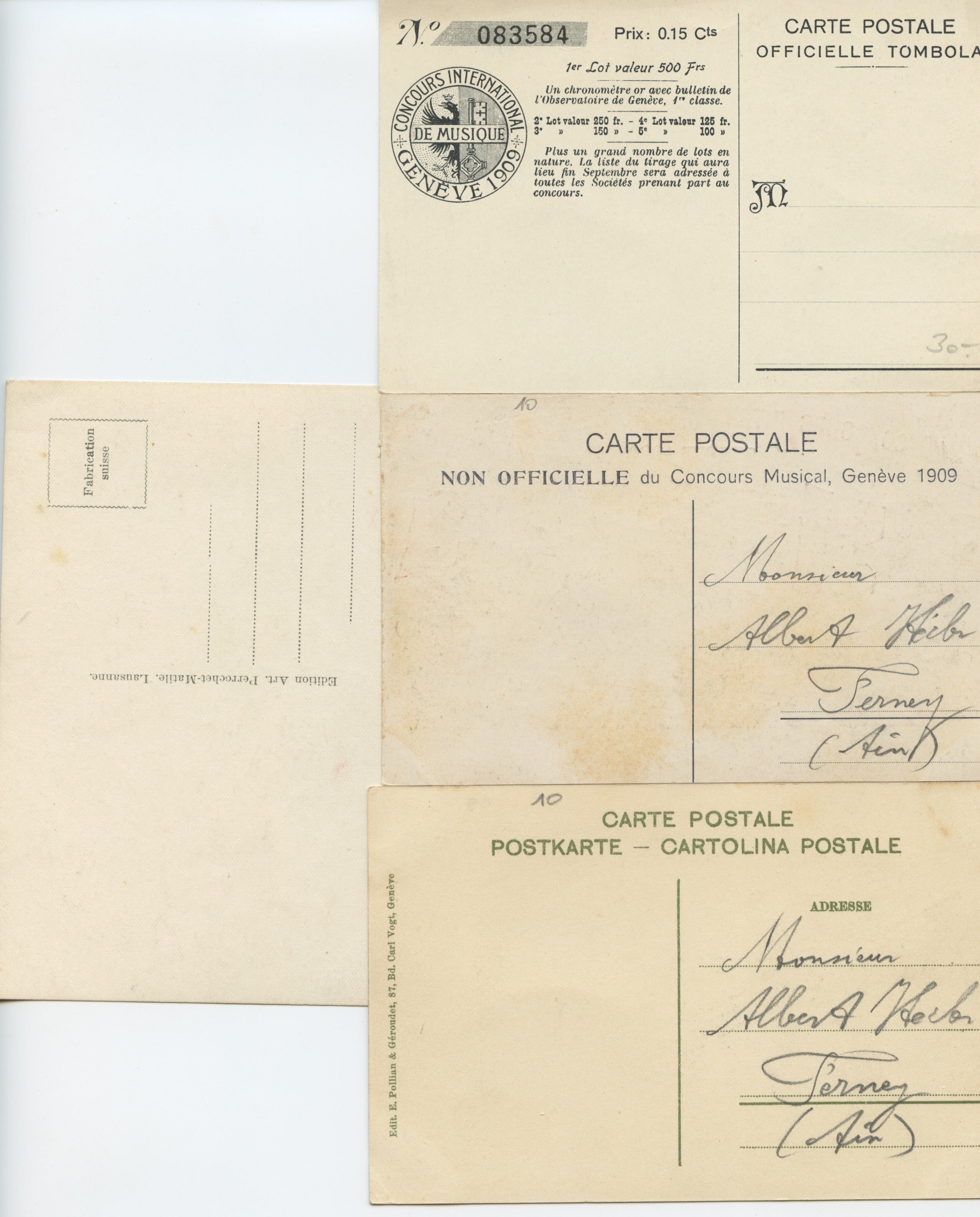 [Concours international de musique, Geneva, 1909]. Postcards related to the Concours international de musique, held in Geneva in 1909. Three postcards.  Two of them are official advertisements for / commemorations of the competition, which was held from August 14 to 16, 1909, and feature attractive illustrations depicting Geneva, its lake and allegorical figures; one of the cards doubles as a ticket for a lottery.  A third card, identified as "unofficial," features a caricature of the event; interestingly, the artist's signature, "GTR," looks like the abbreviation of the signature of one of the official cards, "Gantner"; it is addressed to "Monsieur Albert [illegible] Perney (Ain[é])."  Slightly different formats, approximately 3.5 x 5.5 inches (9.3 x 14 cm).  In very good condition.