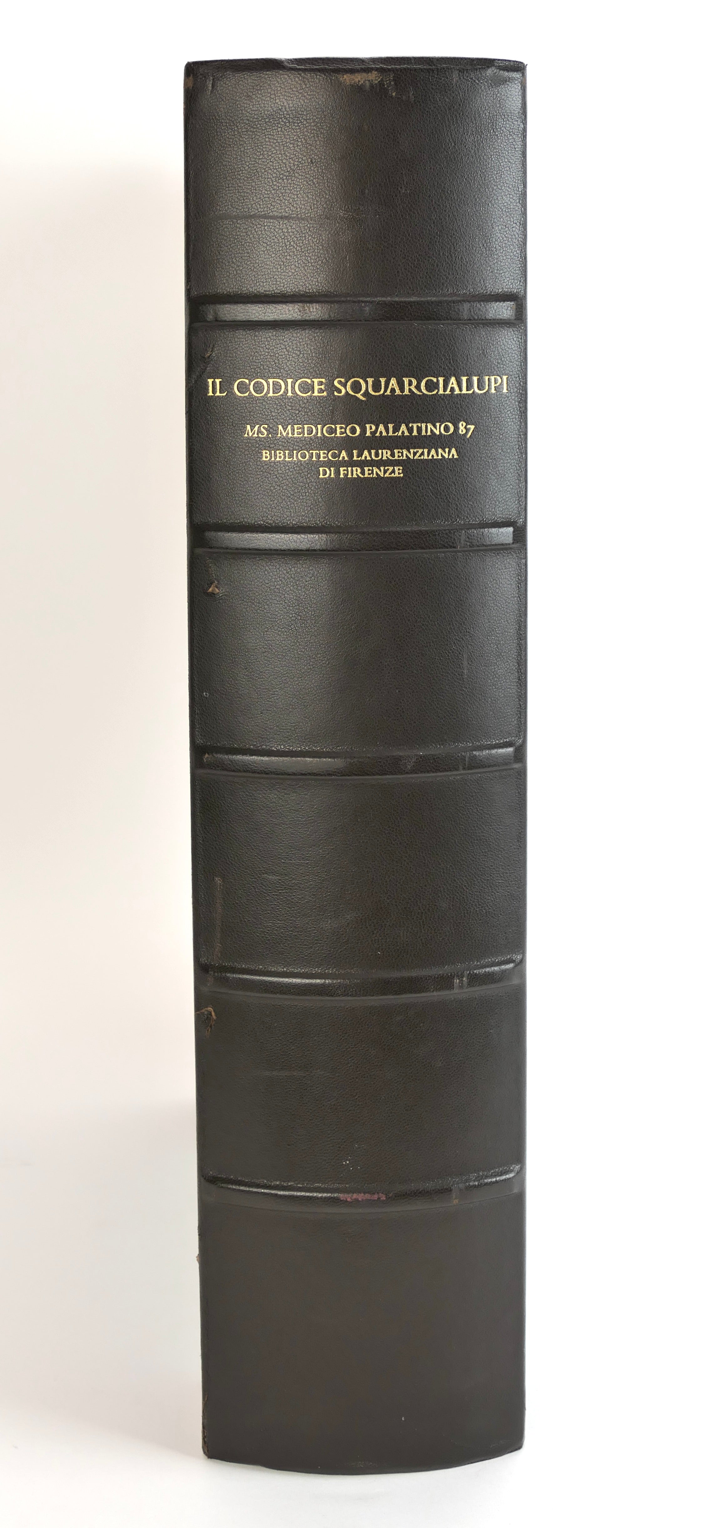 [Squarcialupi, Antonio. (1470-1480)]. Il Codice Squarcialupi [Codex] DELUXE Facsimile Edition . Giunti Editore: Giunti Editore (Libr. Musicale Italiana). 1992. Complete facsimile edition in full 8-color (+ gold) reproduction of the complete original manuscript in original format. Publisher's hardcover binding (29 x 41cm., facsimile of the original binding), 442 pp., together with a text volume (287 pp. edited by F. Alberto Gallo, with contributions by John Nádas, Kurt von Fischer, Luciano Bellosi, Margherita Ferro Luraghi, Nino Pirrotta, Giuseppe Tavani, Giulio Cattin, and Agostino Ziino) printed on handcrafted paper and bound in Fabriano paper. Limited edition of 998 numbered copies only, this example number 555/998, protected by a publisher's box (18" H x 13.5" W x 4.75"; 46 x 32cm) cloth boards with gilt stamping, spine in leather. Interior and texts in very fine condition, box with some nicks and scrapes, overall very good. Rare. Long ago sold out by the publisher (original price was 2400 Euro).