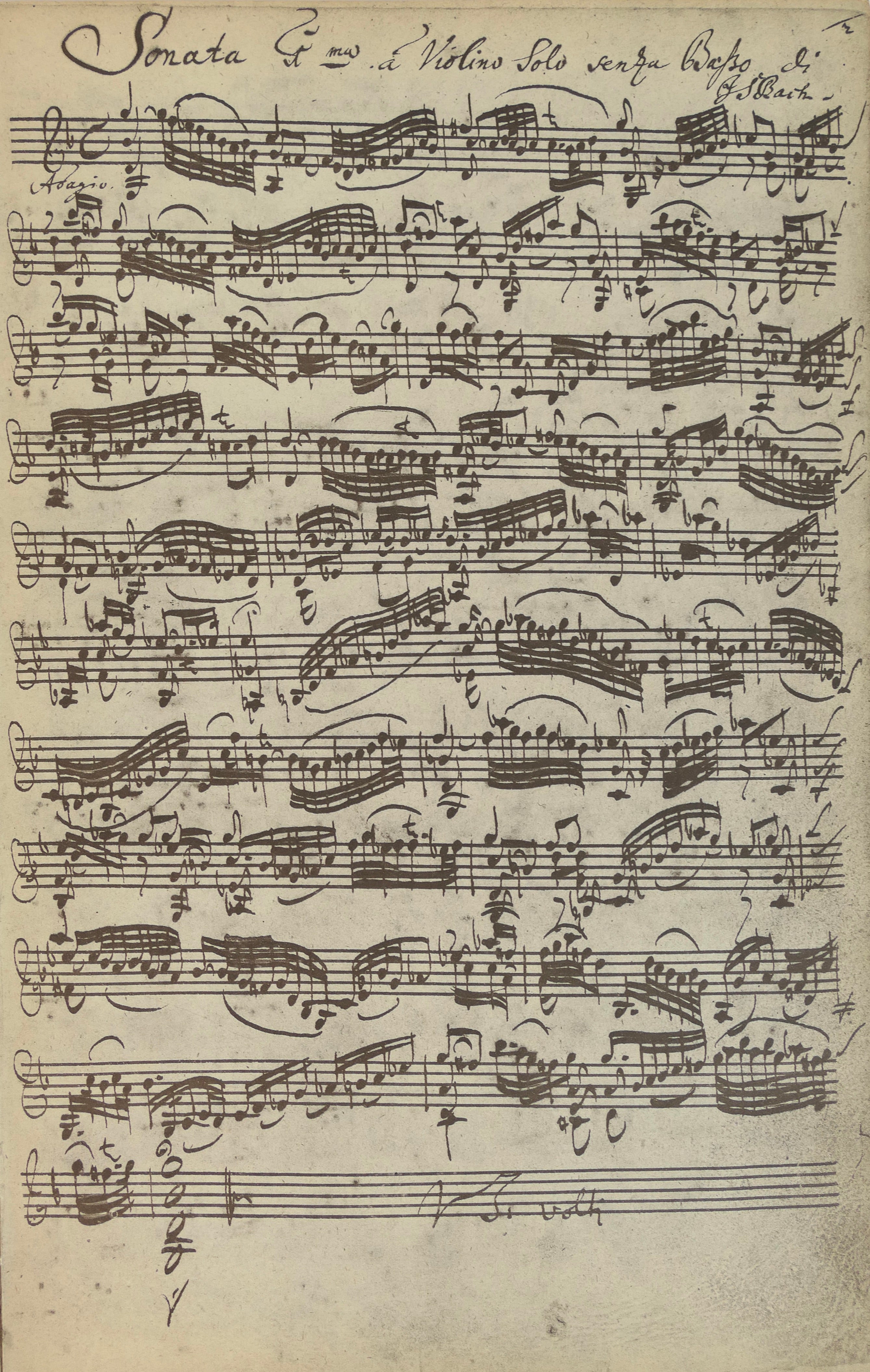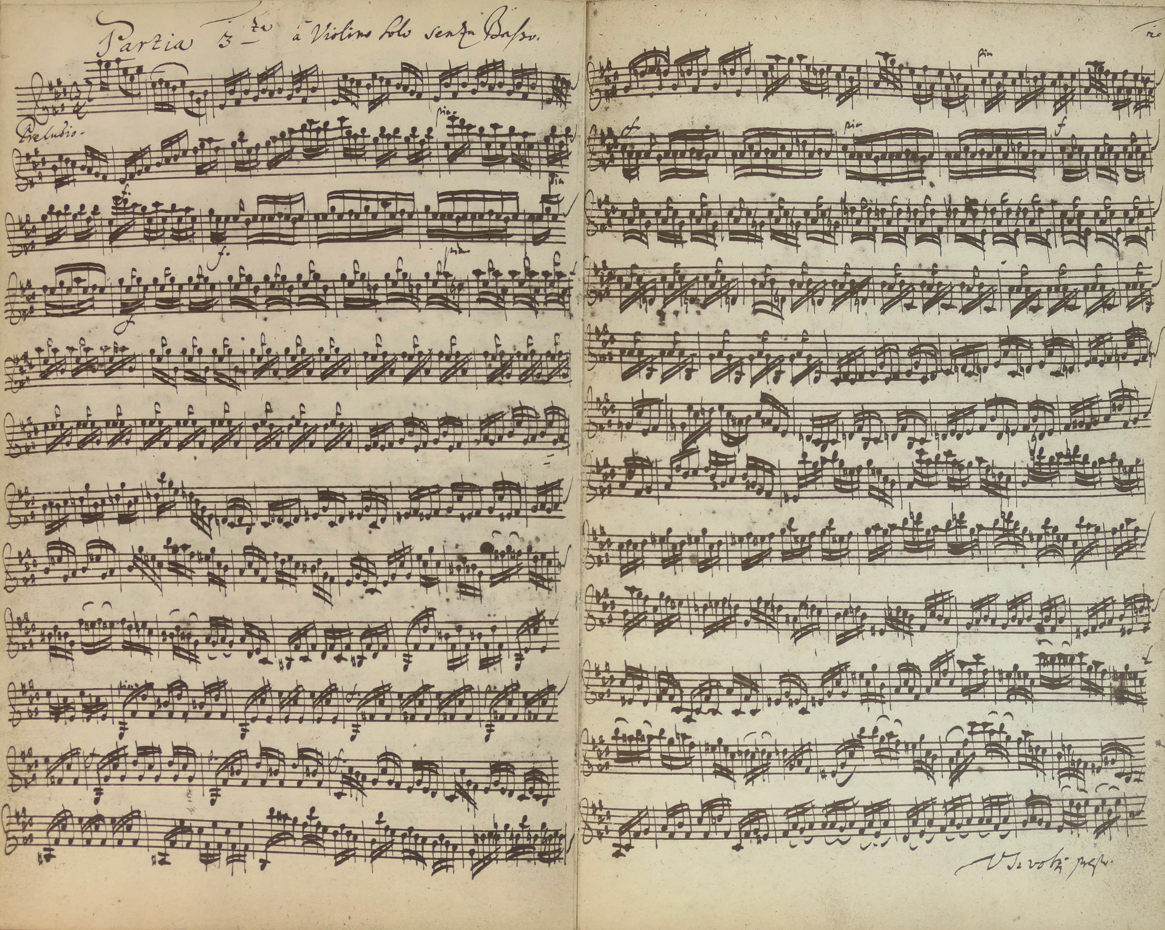 Superb monochrome collotype of the 1720 autograph, issued on the occasion of Bachfest 1950 in Göttingen. One of the most beautiful and meticulous of all of Bach's manuscripts, here Bach clearly has taken performance from the autograph into consideration—by using comparatively large note heads, detailed articulation and phrasing marks, "custodes" that sit nearly throughout the manuscript at the end of each staff and anticipate the pitch at the beginning of the following staff, and by diligently planning the page layout with only few page turns, which are accompanied with the instruction "volti subito" (turn immediately).