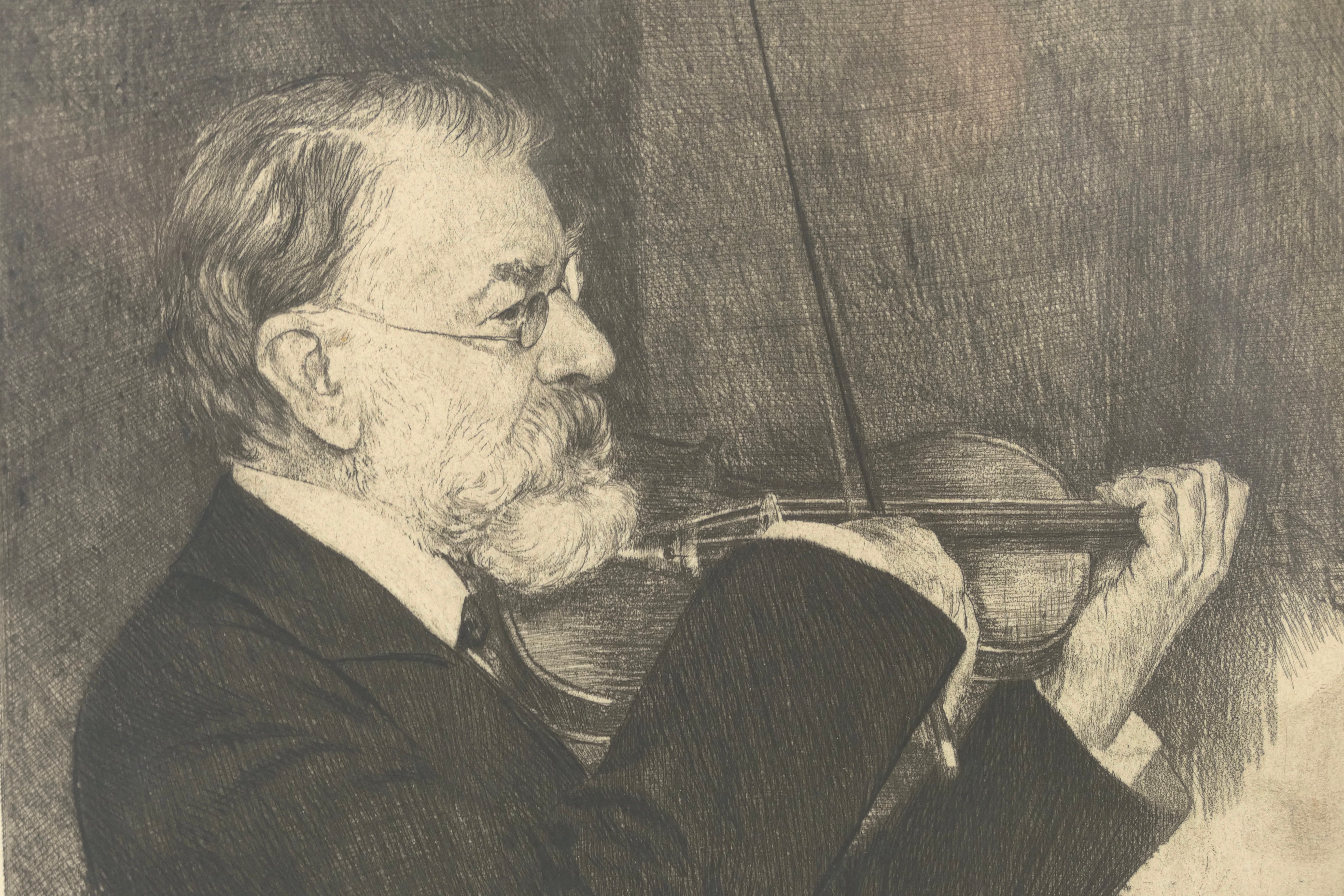 Undoubtedly the most famous of all lifetime portraits of the great violinist, who is shown here seated in the context of the Joachim Quartet. Executed by the Austrian artist c. 1904, signed "F. Schmutzer" in pencil at the lower right. Etching on paper, plate size 8.5 x 8.9 inches. Wide margins, over 1.5 inches, framed to 12.5 x 15.25 inches overall. A richly ink impression of this scarce print, which was reproduced in the New York Times in their 2007 story commemorating the 100-year anniversary of Joachim's death.