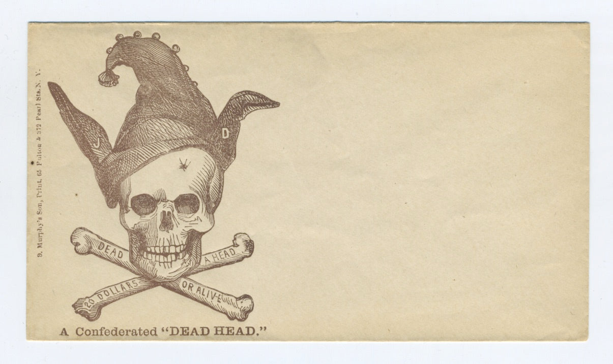 Graphically striking ca.1861 Anti-Confederate States Civil War illustrated patriotic envelope/cover with a fantastic, skull and crossbones cache. Measuring 5 1/2" x 3 1/8" and titled “A Confederate ‘DEAD HEAD’”, it features a human skull above crossed bones, the skull wearing the hat of a court jester and donkey ears, text on the crossed bones reading “20 Dollars a Head” and “Dead or Alive” and featuring a bullet hole in the forehead of the skull and the initials “JD” (for Jefferson Davis) on the donkey ears. The full envelope, including both front and back panels and the original flap closure, in very fine condition.