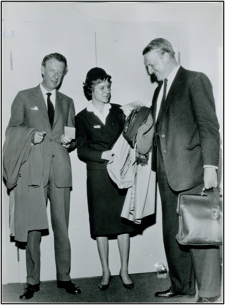 A fine original photograph of the great composer/pianist and his partner, Peter Pears, arriving at Vibingen for the music festival. Stamped by Lufthansa Archiv on the verso. 24 X18 cms.