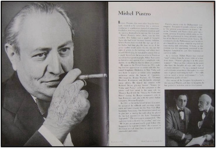 Piastro was one of Auer's great Russian-Jewish students, and with Elman and Zimbalist, he was exempted from military service by the Czar in order to further his career. Concertmaster of the of the San Francisco Symphony from 1925-31, he later was engaged by Toscanini to lead the NY Philharmonic, and won nationwide renown through his annual broadcasts as soloist with the orchestra. During Barbirolli's leaderhsip of the NY Philharmonic, Piastro was assistant conductor (1941-43), and during this period, also began serving as conductor and violin soloist with the Longines Symphonette, which performed for many years on radio and recordings.