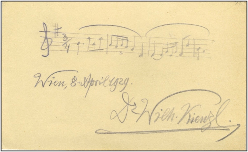 A fine 3 measure AMQS from the Austrian opera composer's most famous work. A quotation from the tenor aria "Selif sind," the hit of 1895, boldy written and signed in pencil, on a postcard, 3 X 5.5 inches.