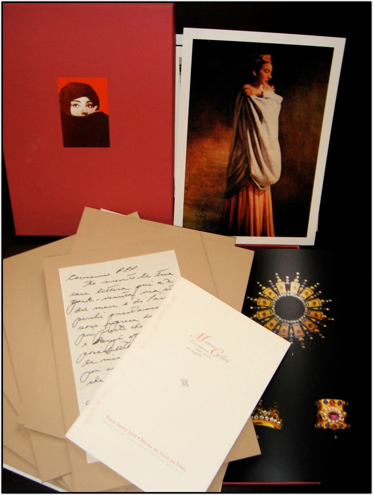 Deluxe box set from the exhibition at the Hotel de Ville de Paris, including a catalogue which consists of a 37 page explanation with photographs of hitherto unshown Callas materials. Plus beautifully reproduced signed and unsigned photographs, as well as numerous facsimile letters to and from Callas (Pasolini, de Hidalgo, Max Lorenz, Visconti etc.) in separate folders, a small catalogue of some of the costumes, dresses and jewels etc. A truly magnificent collection.