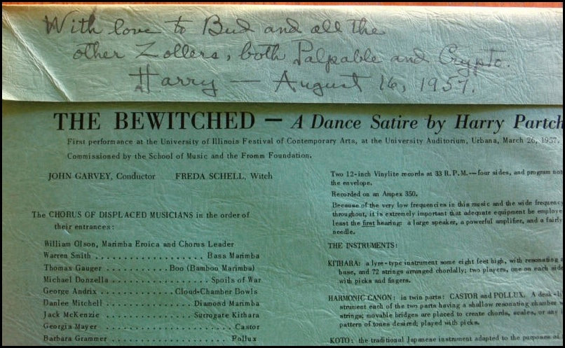 [American Avant-garde] Partch, Harry. (1901 - 1974). "The Bewitched" - Signed and Inscribed. Rare signed double LP set, released by Partch himself on his own private Gate 5 label, this copy signed and inscribed to longtime friends from whom Partch rented a cabin in Santa Rosa, CA: "With love to Bud and all the Zollers, both Palpable and Crypto. Harry - August 16, 1957." The records and the sleeve in very fine condition.