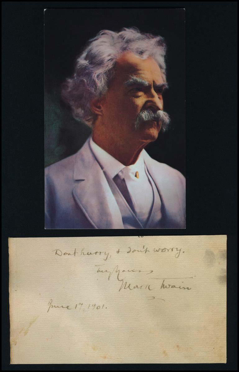Twain, Mark. [Samuel Langhorne Clemens] (1834 - 1910). Autograph Signed Quotation. AQS, signed "Mark Twain," in full: "Don't hurry, + don't worry. Truly Yours / Mark Twain. June 17, 1901." Together with a tinted postcard photograph. Fine. Approximately 8 x 14 cm.