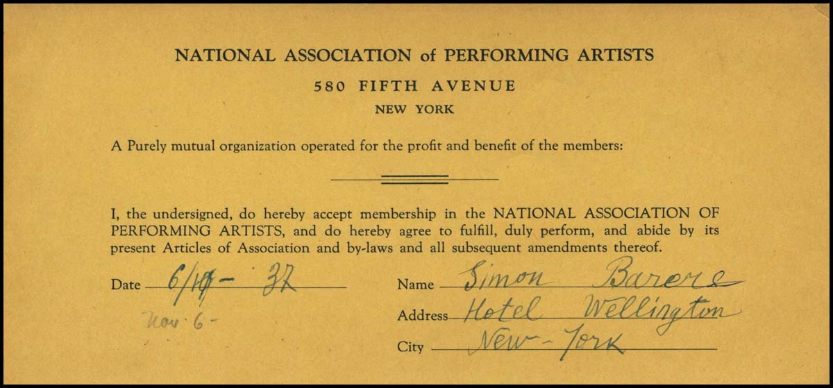 Barere, Simon. (1896 - 1951). Signed National Association of Performing Artists Membership Form. Elusive signed document from the renowned Russian-born American virtuoso pianist, celebrated for his legendary speed and finger dexterity. On 2 April 1951, Barere suffered a cerebral hemorrhage during a performance of Grieg's Piano Concerto at Carnegie Hall, with Eugene Ormandy conducting the Philadelphia Orchestra. Barere subsequently collapsed and died backstage shortly thereafter.