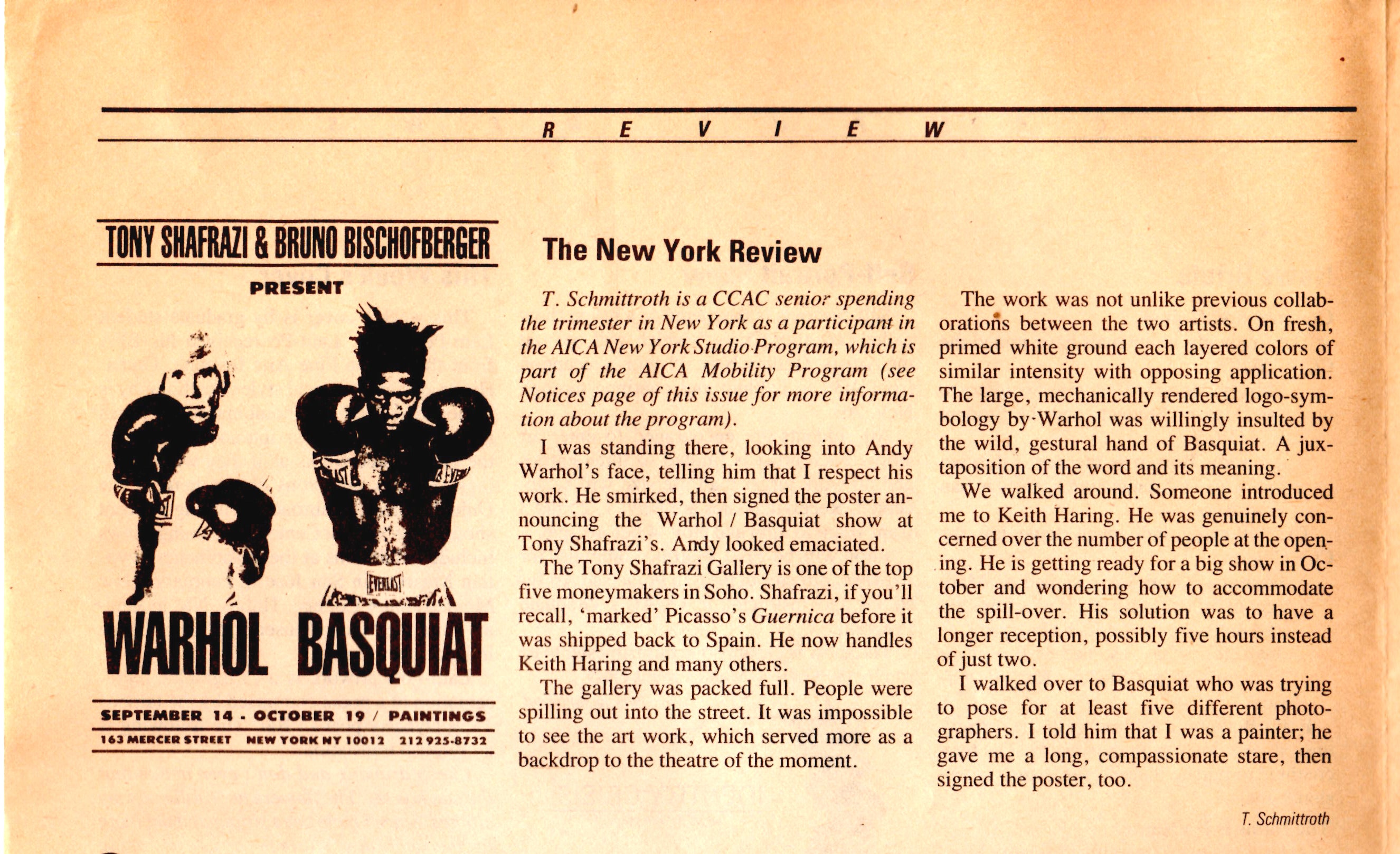The opening of the exhibition was attended by the poster's consignor and her recollections of the event, including descriptions of the moment both Warhol and Basquiat signed the piece, were documented in the October 1985 issue of the California College of Arts and Crafts newsletter. In the article, the opening is described as packed and that "it was impossible to see the art work, which served more as a backdrop to the theatre of the moment ... the large, mechanically rendered logo-symbology by Warhol was willingly insulted by the wild, gestural hand of Basquiat."