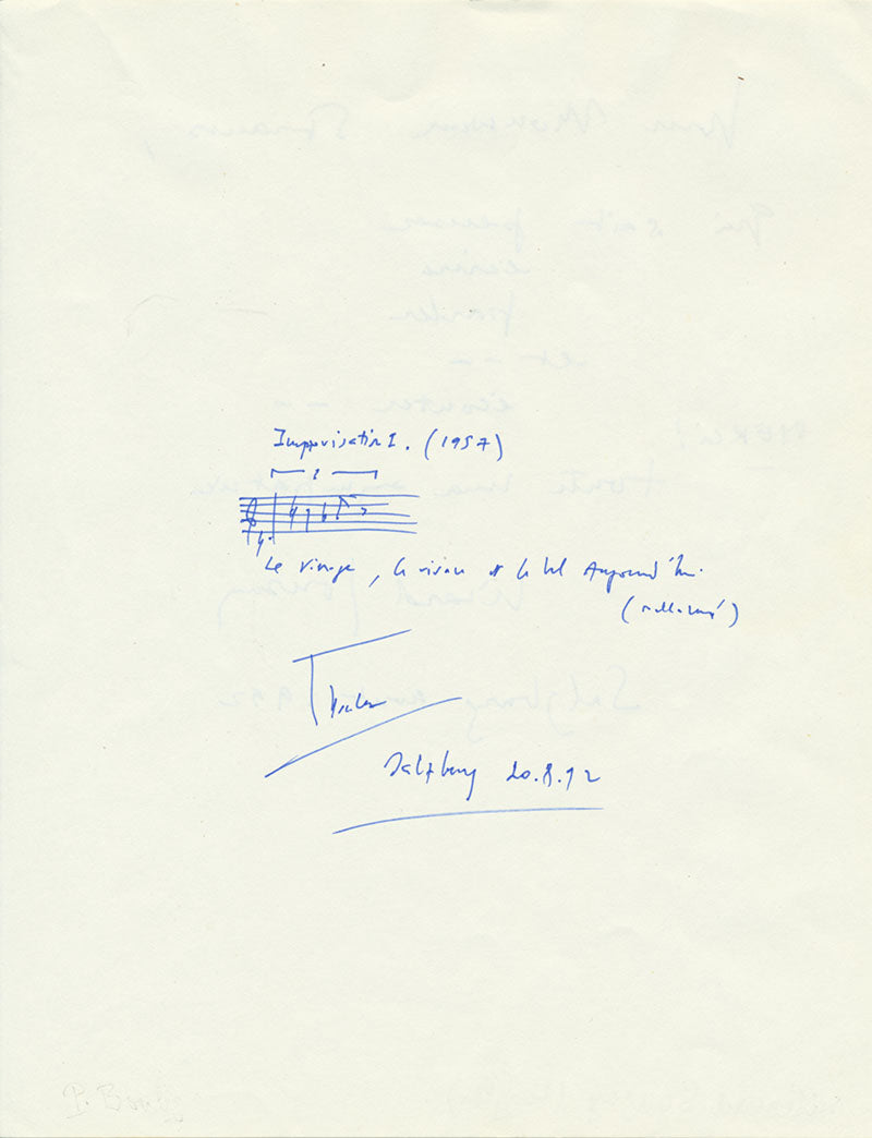 Very uncommon AMQS from important French composer and conductor, one of the major innovators and forces in 20th century music, who has here neatly penned a short quotation from Improvisation I, part of his longest work, Pli selon pli. Boulez has written out one measure and the title of the movement, "'Le vierge, le vivace et le bel aujourd'hui' (Mallarmé)", signed and dated Salzburg, August 20, 1992. On the verso, a further autograph and inscription from the French baritone Gérard Souzay, dated Salzburg, August 1992.