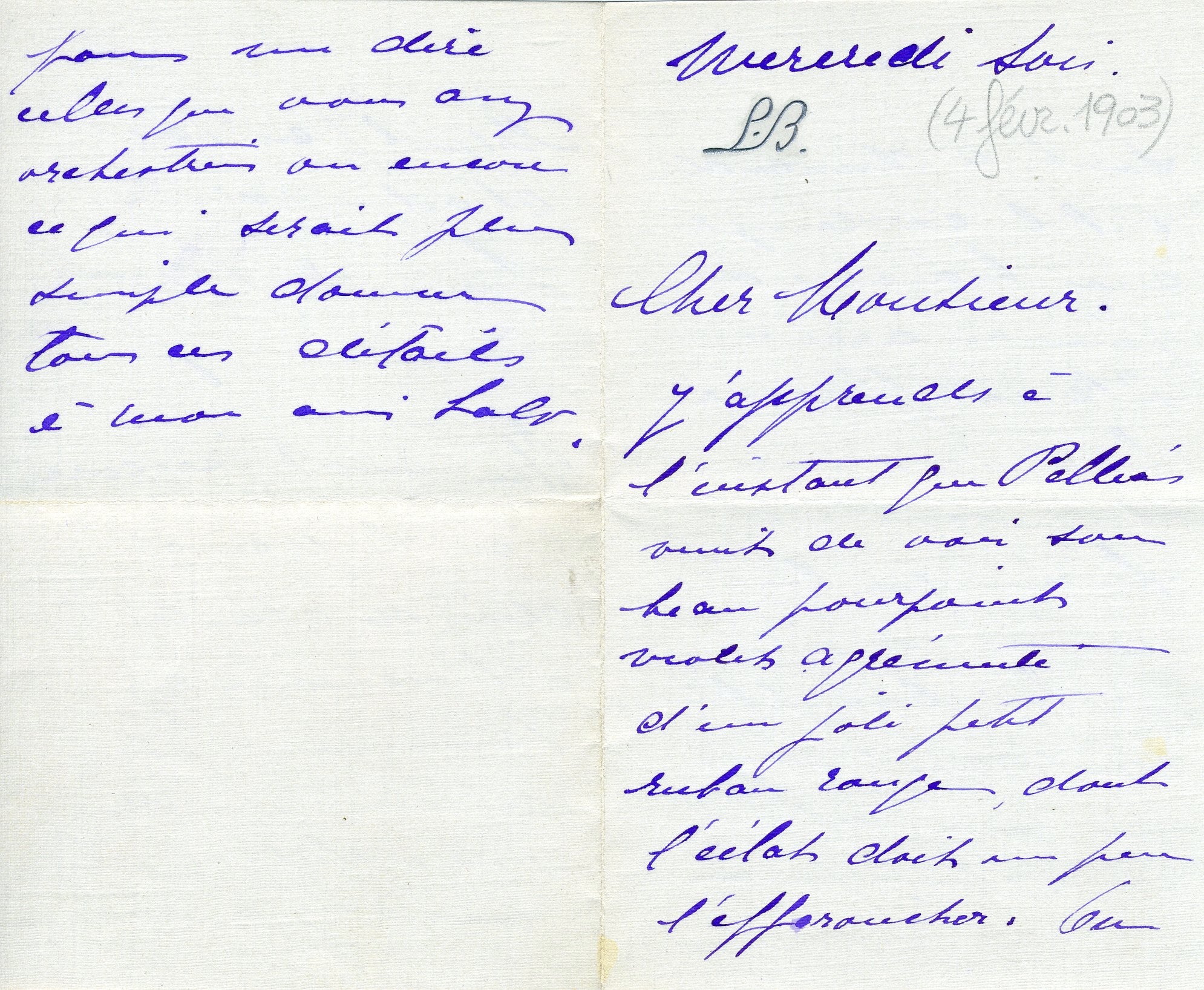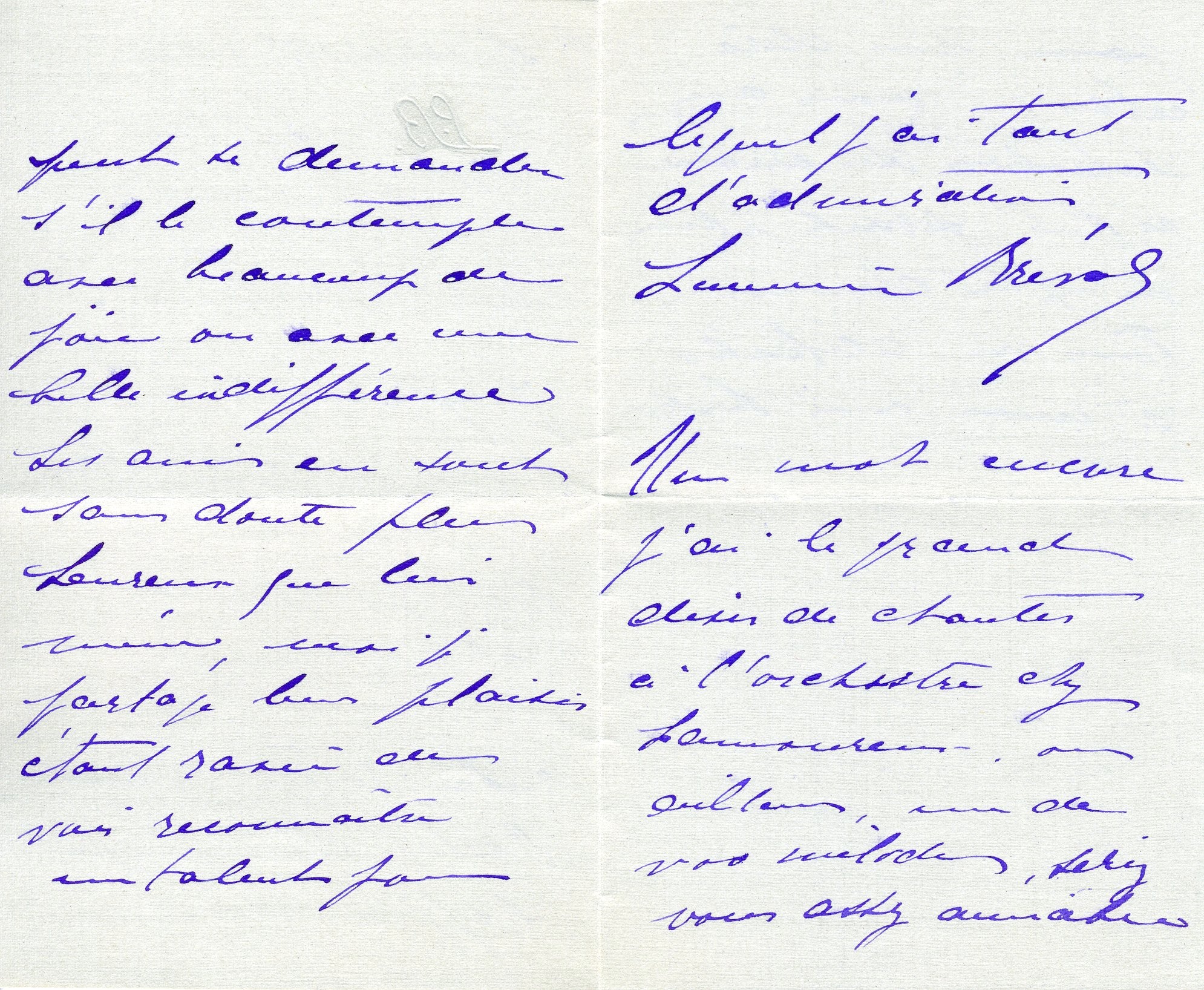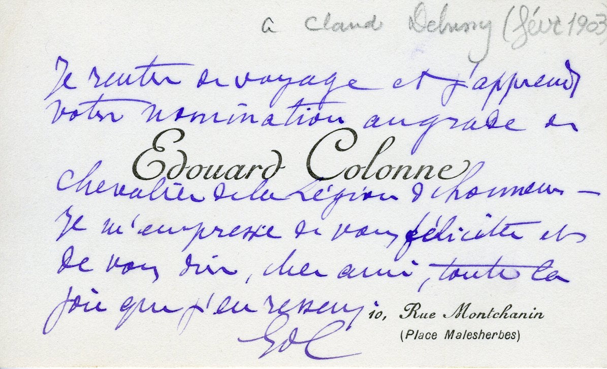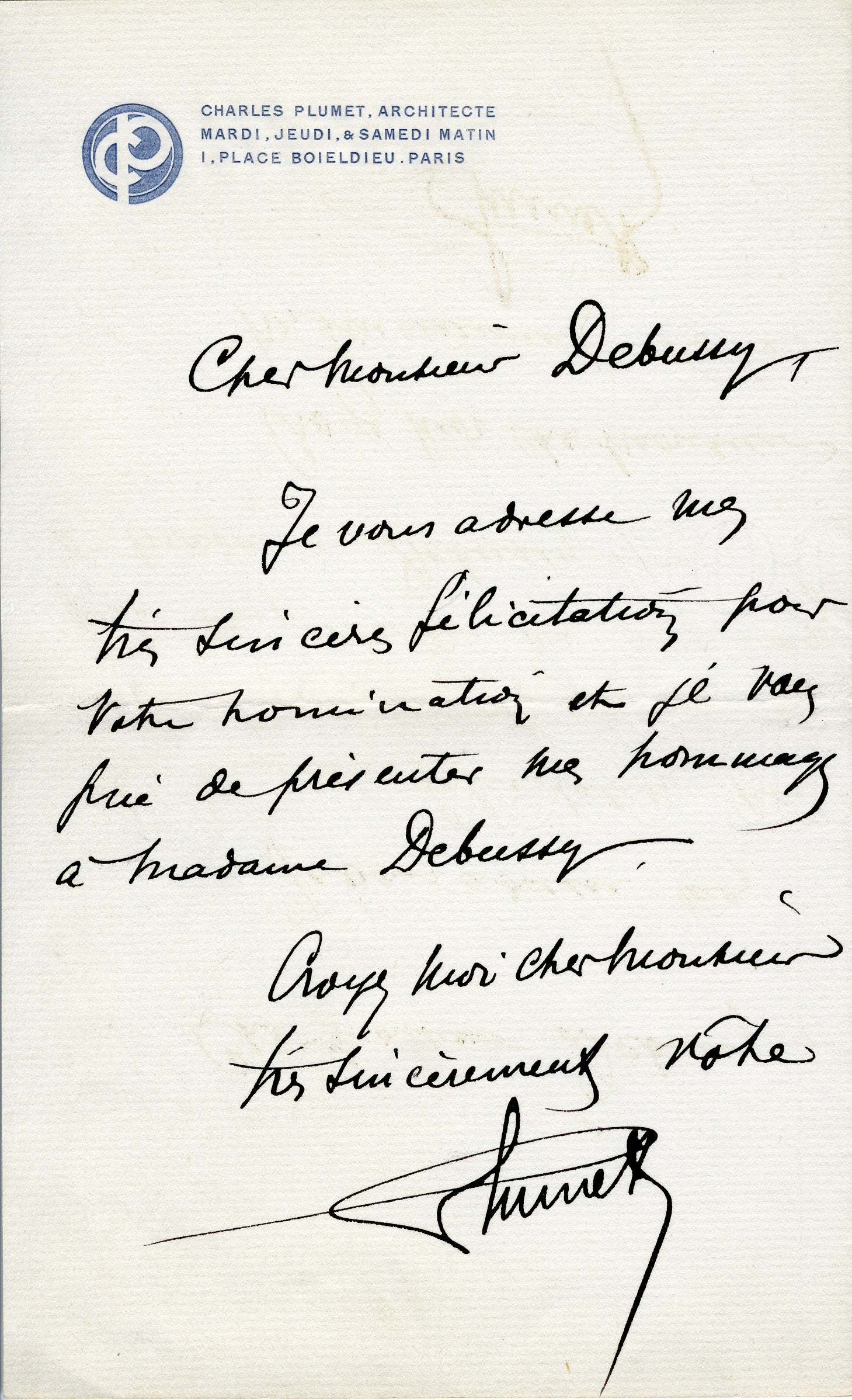 Three letters congratulate Debussy on his nomination to the Légion d'honneur in 1903: one autograph note on the visiting card of conductor Edouard Colonne (Paris, [February 1903], 1 p.); one ALS from the soprano Lucienne Bréval (n.p., [February 4, 1903], 4 pp.) which also mentions her desire to sing one of Debussy's mélodies with orchestra; and one ALS from the architect Charles Plumet (Paris, n.d., 1 p.).