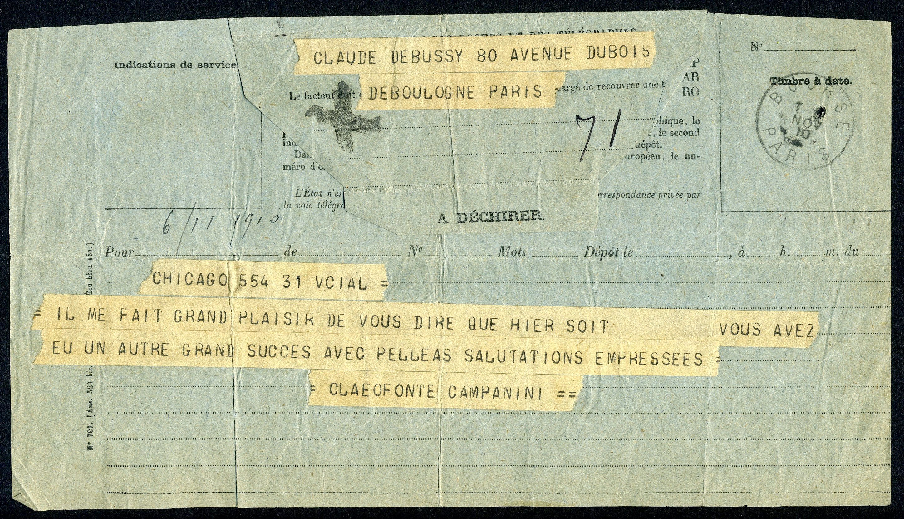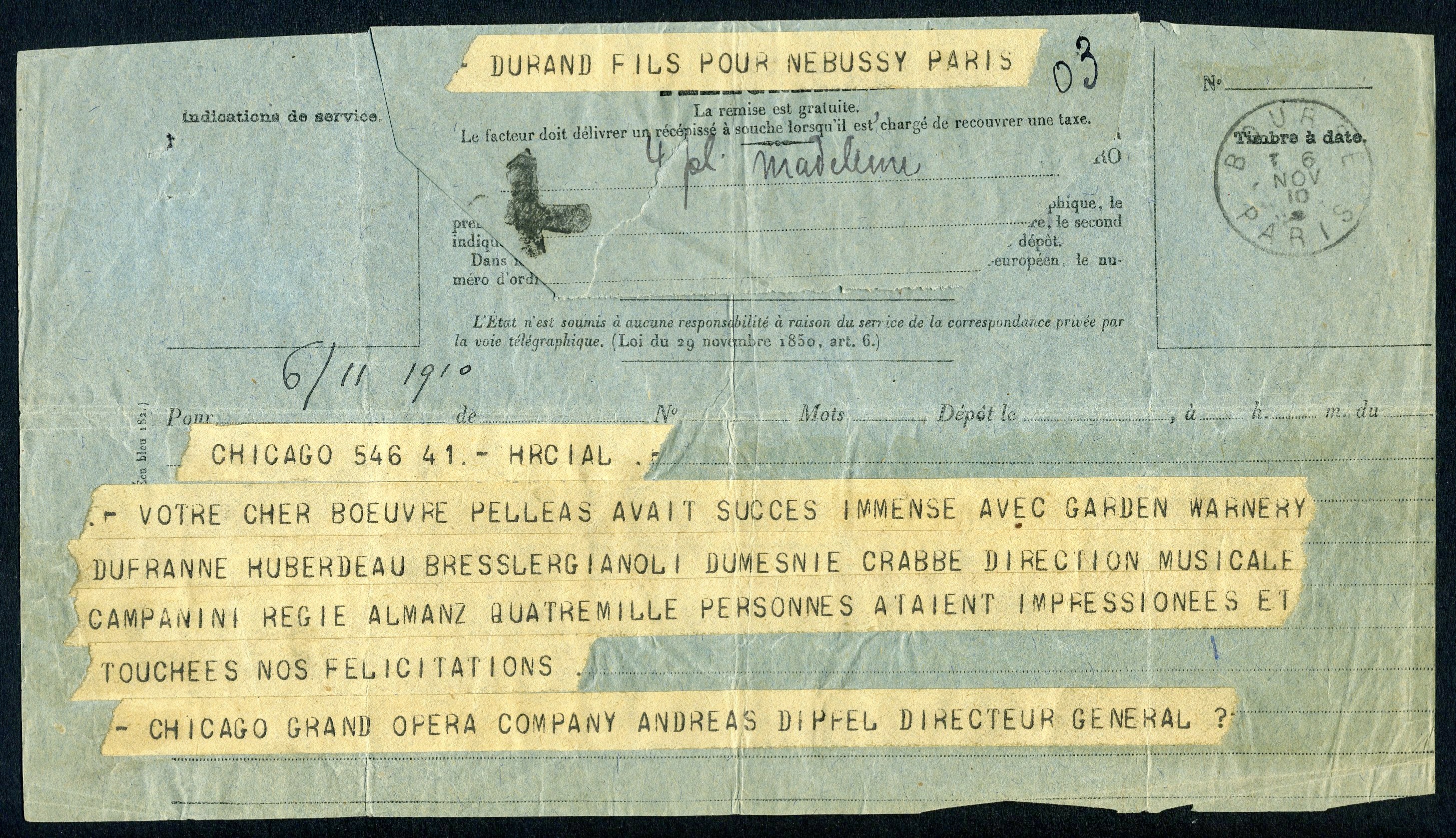 Two telegrams dated June 11, 1910 send congratulations to Debussy on the successful performance of his Pelléas et Mélisande in Chicago from the conductor, Cleofonte Campanini, and the director general of the Chicago Grand Opera Company, Andreas Dippel: "Four thousand people were impressed and touched. Our congratulations."