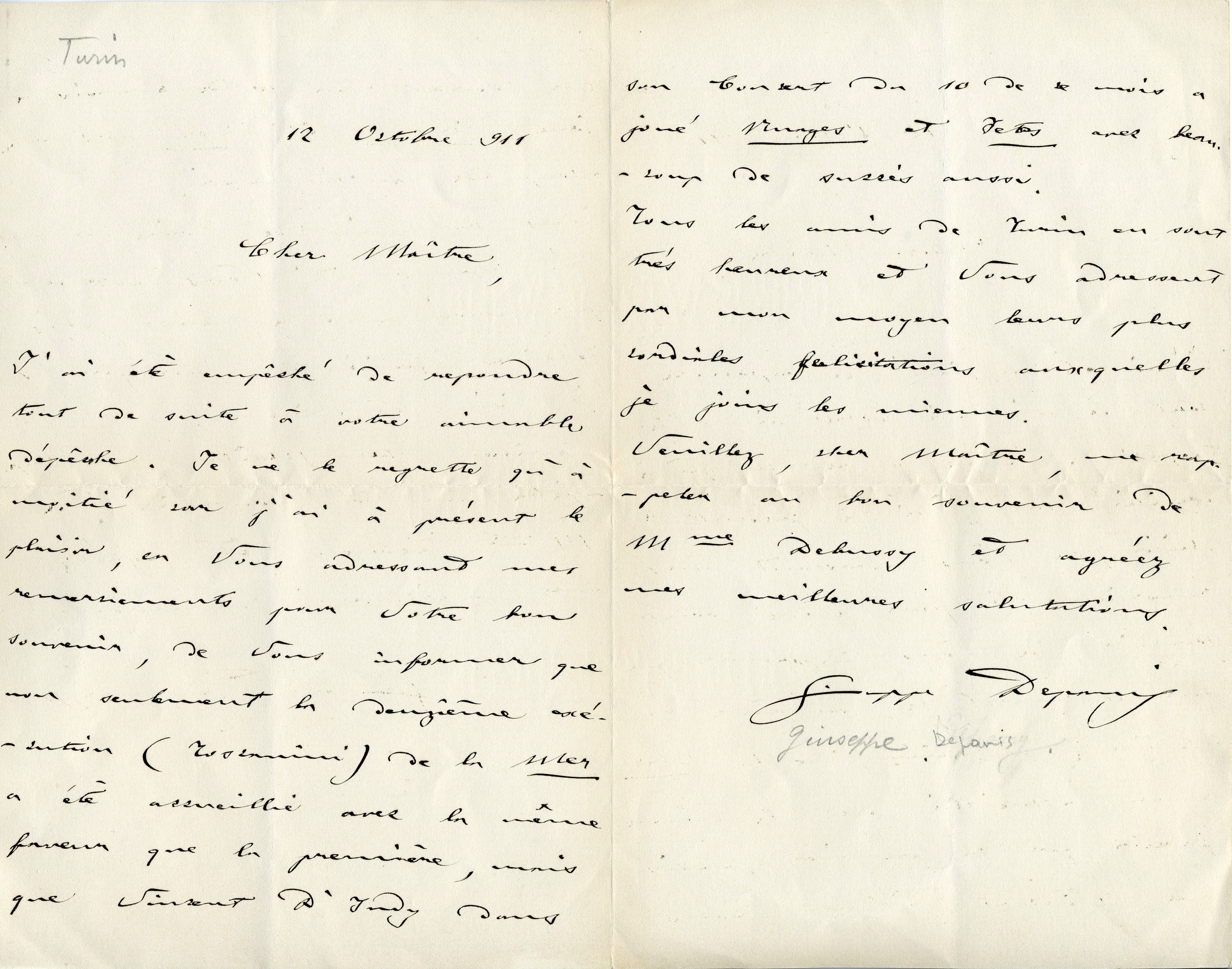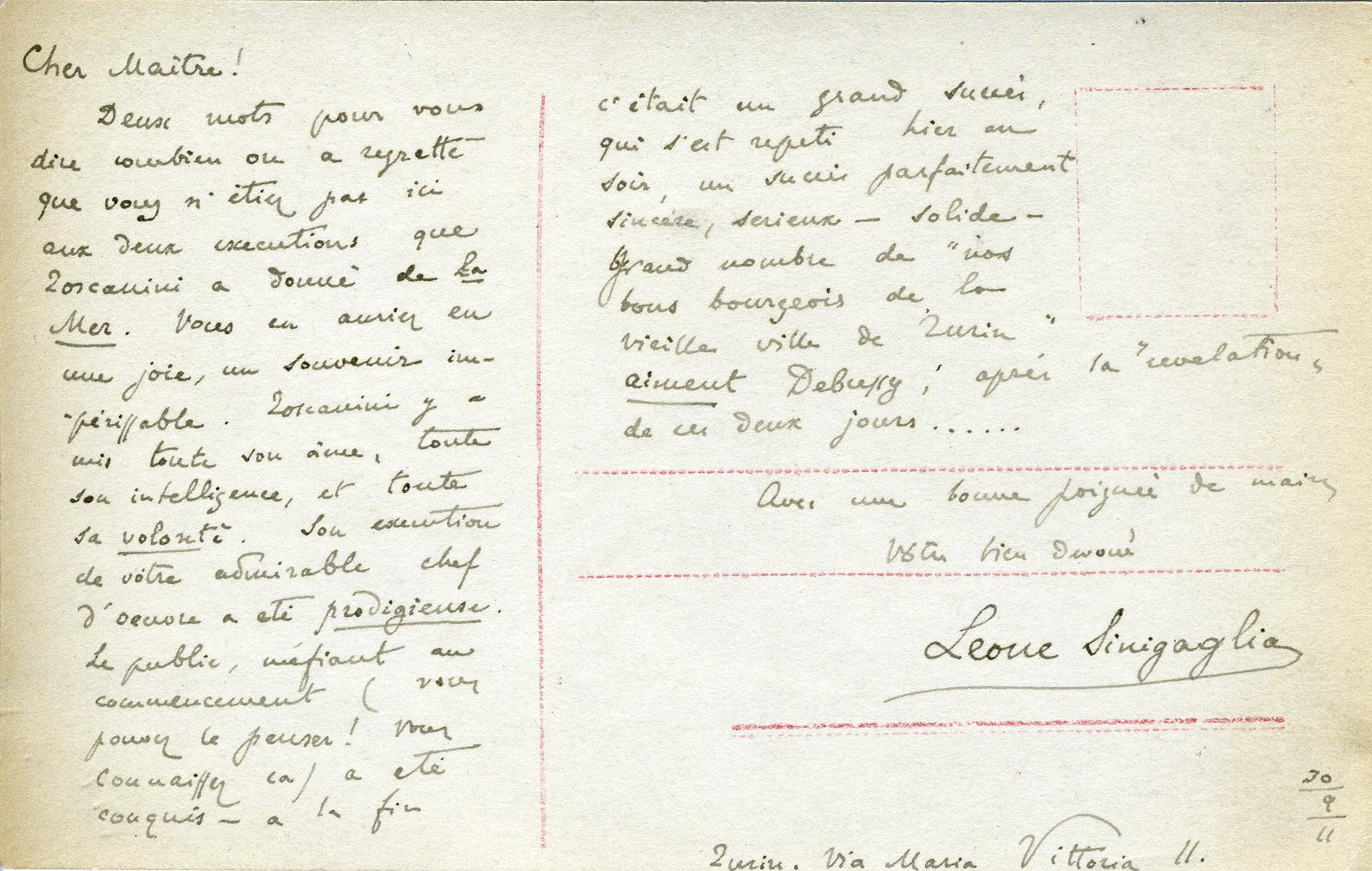 Two letters send congratulations to Debussy on the performance of his La Mer under Toscanini in Turin in 1911. On a photograph postcard (Turin, September 30, 1911), the composer Leone Sinigaglia writes that "It would have been a joy for you, a lasting memory. Toscanini put his whole soul into it, all his intelligence, and all his will. His execution of your admirable masterpiece was prodigious. The public, wary at the beginning (as you may imagine! you know this well), was won over -- at the end it was a great success, which was repeated yesterday evening..." The critic Giuseppe Depanis (Turin, October 12, 1911, 2 pp.) writes that "not only was the second presentation (Toscanini) of La Mer received with the same good favor as the first, but Vincent D'Indy also performed Nuages andFêtes in his concert on the 10th of the month with great success."