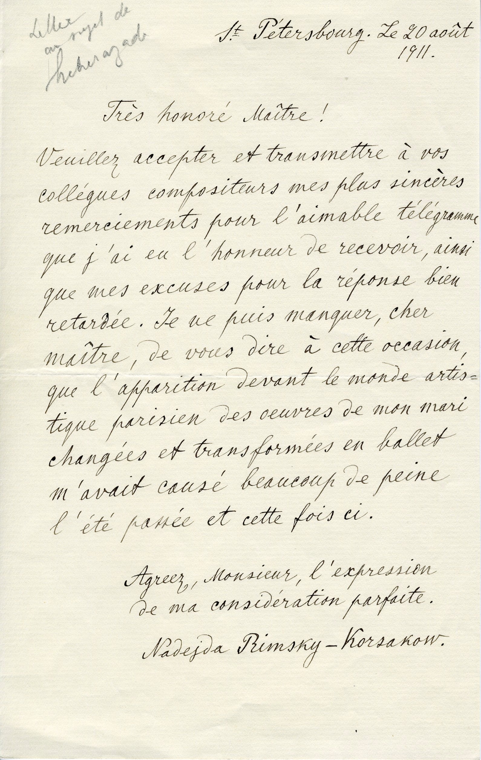 An autograph letter from Nadejda Rimsky-Korsakov (St Petersburg, August 20, 1911, 1 p., with envelope) thanks Debussy for his telegram, and mentions in reference to the Ballets Russes' adaptation of her husband's famous work Scheherazade that "the appearance before the artistic Parisian public of my husband's works, changed and transformed into ballet, caused me great pain last summer and this time."