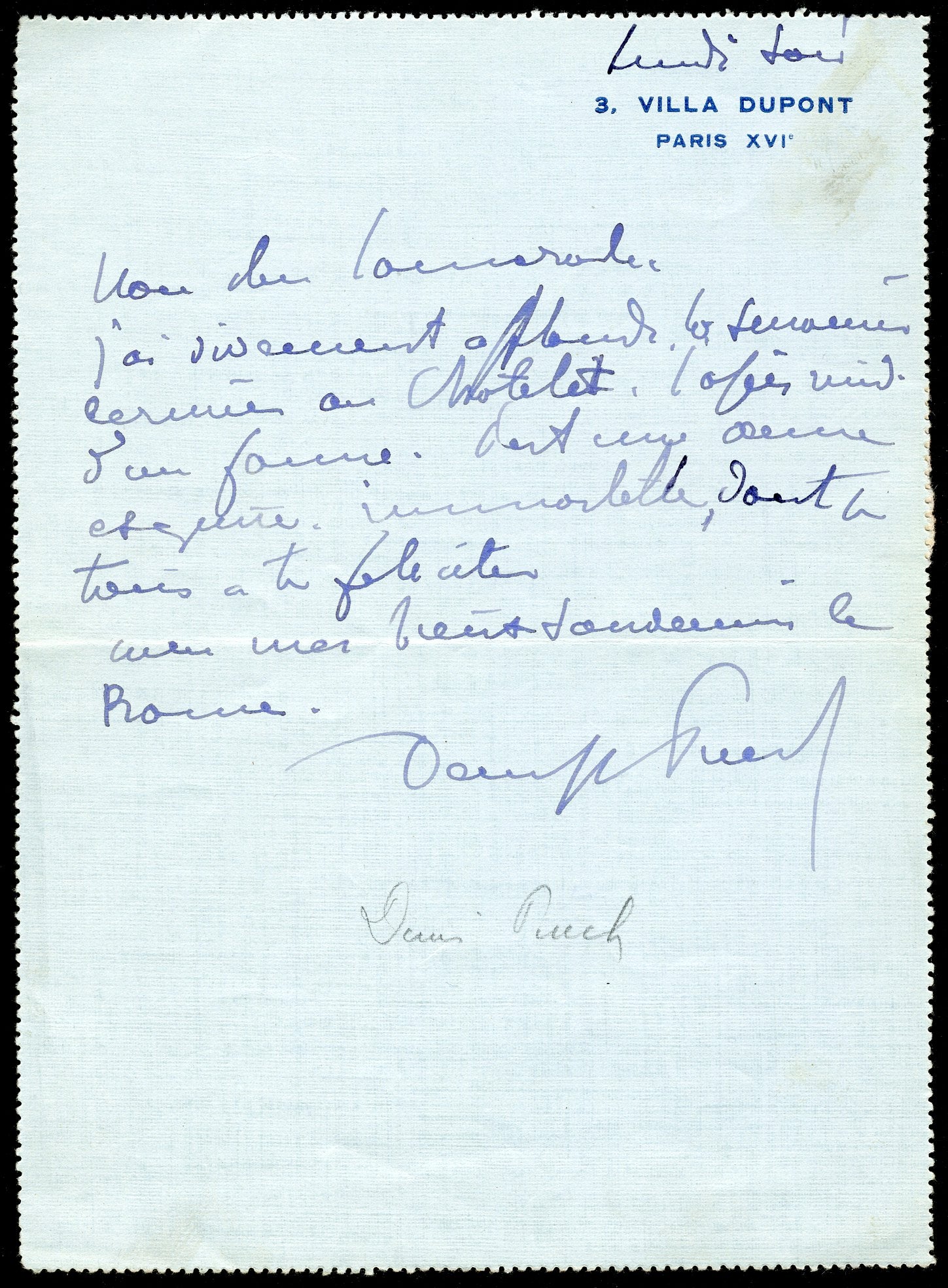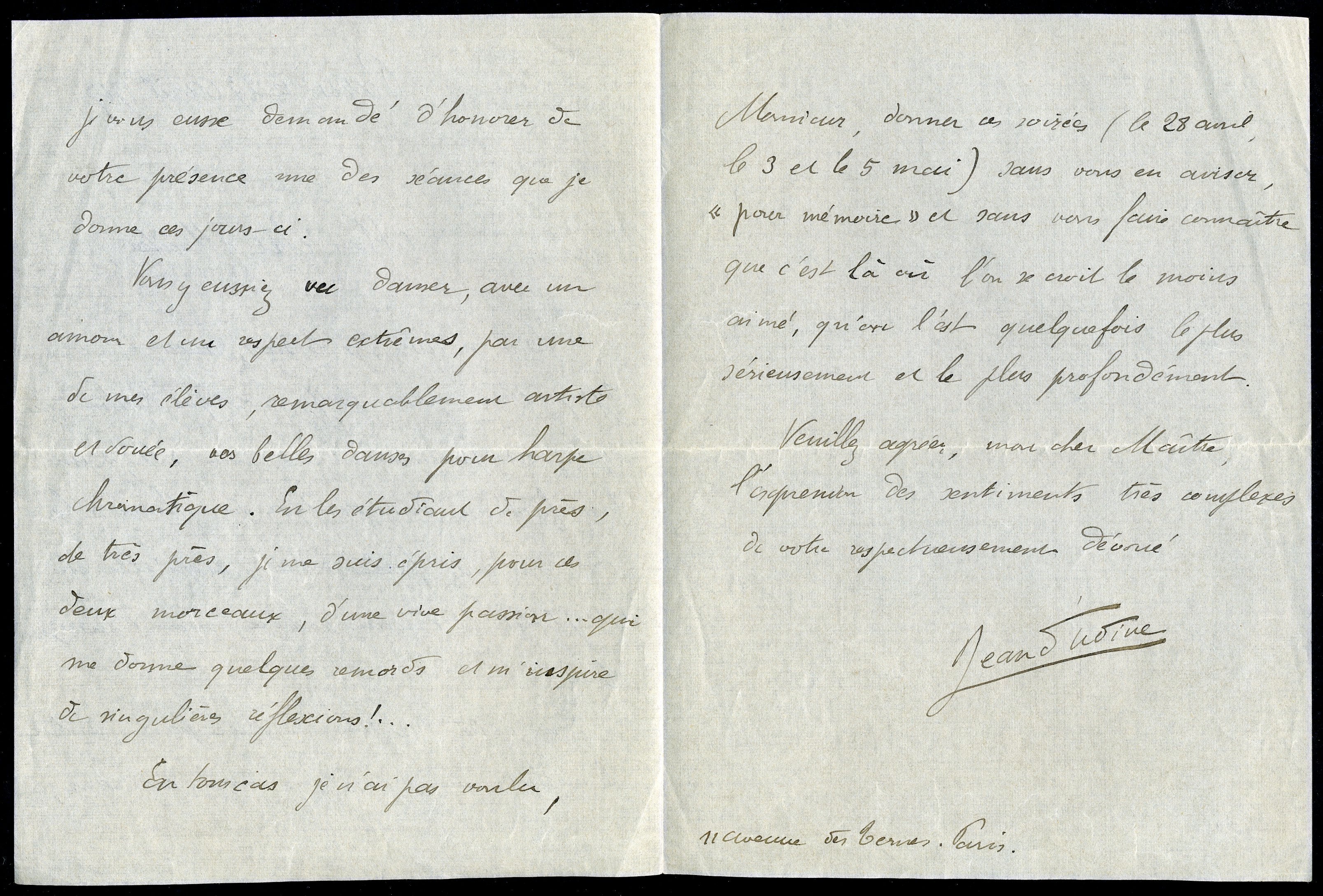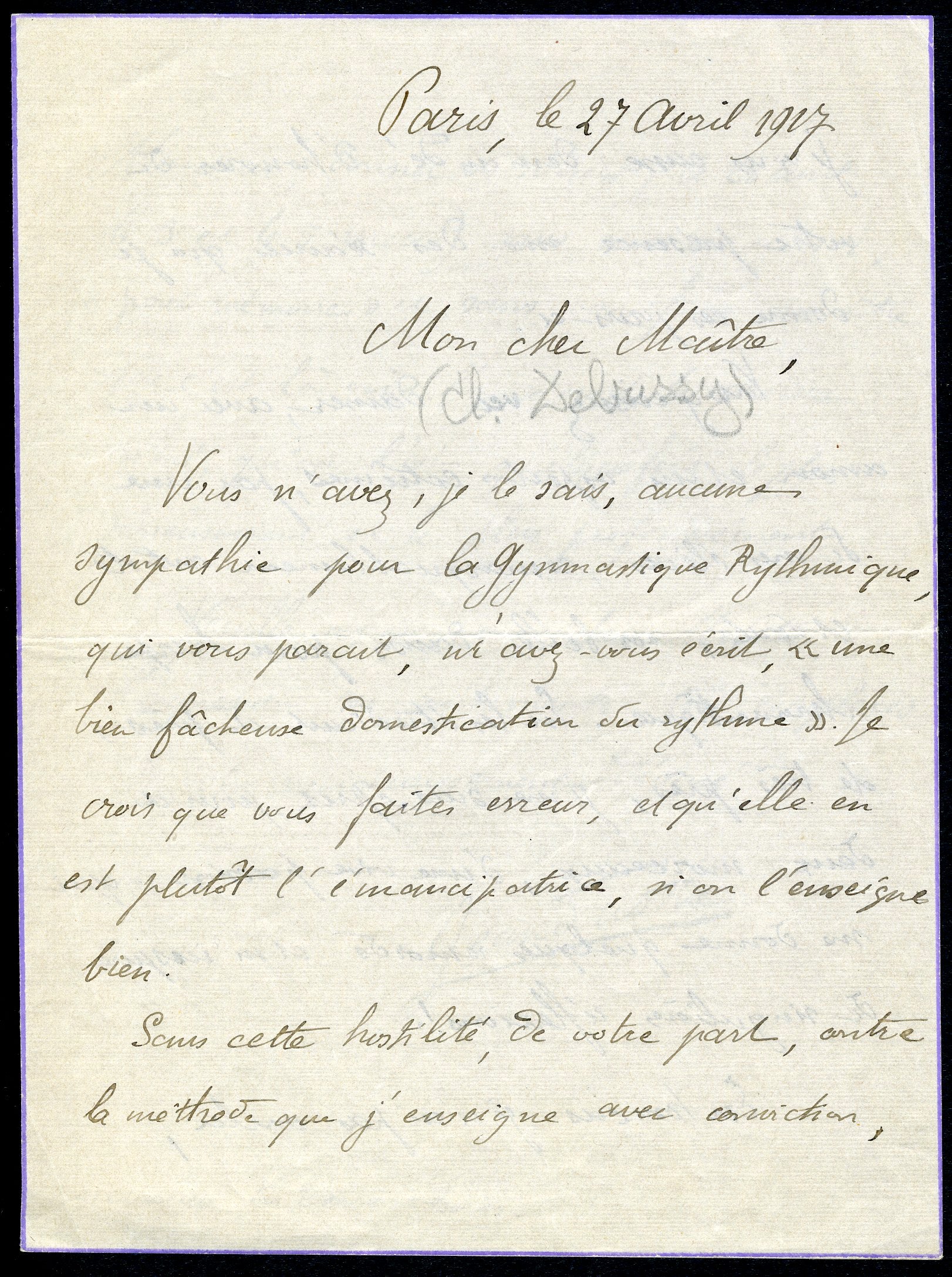 An autograph letter from the composer and musicologist Jean D'Udine (Paris, April 27, 1917, 3 pp.) invites Debussy to one of Udine's salons, despite Debussy's known disdain for his school of dance: "I know you have no sympathy for rhythmic gymnastics, which seem to you, you have written, 'a very disagreeable domestication of rhythm.' I believe that you are wrong, and that they are rather an emancipation of rhythm, when taught well. Without any hostility on your part towards the method which I teach with conviction, I would like to ask you to honor with your presence one of the evenings which I am hosting at present. You would there see danced, with extreme love and respect by one of my students, a remarkable artist, your beautiful dances for chromatic harp [...] I did not want to give these evenings (April 28, and May 3 and 5) without informing you, pour memoire, and without letting you know that it is sometimes where one feels the least loved that one is actually the most seriously and profoundly loved..."