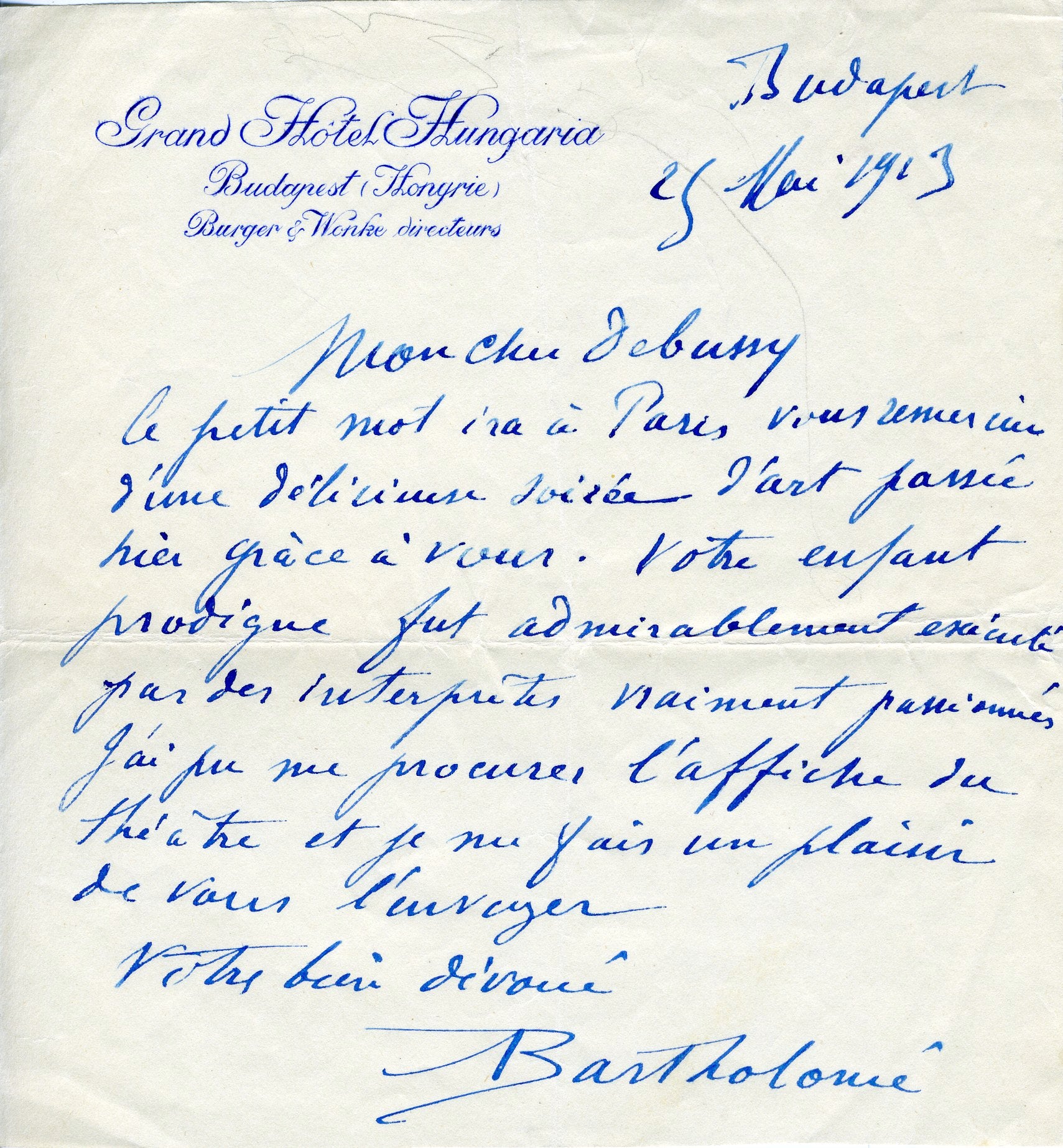 A short autograph letter from the sculptor [Albert] Bartholomé (Budapest, May 25, 1913, 1 p.) informs Debussy that his cantata L'enfant prodigue "was admirably executed by truly passionate performers. I was able to obtain the poster from the theater and will be pleased to send it to you."