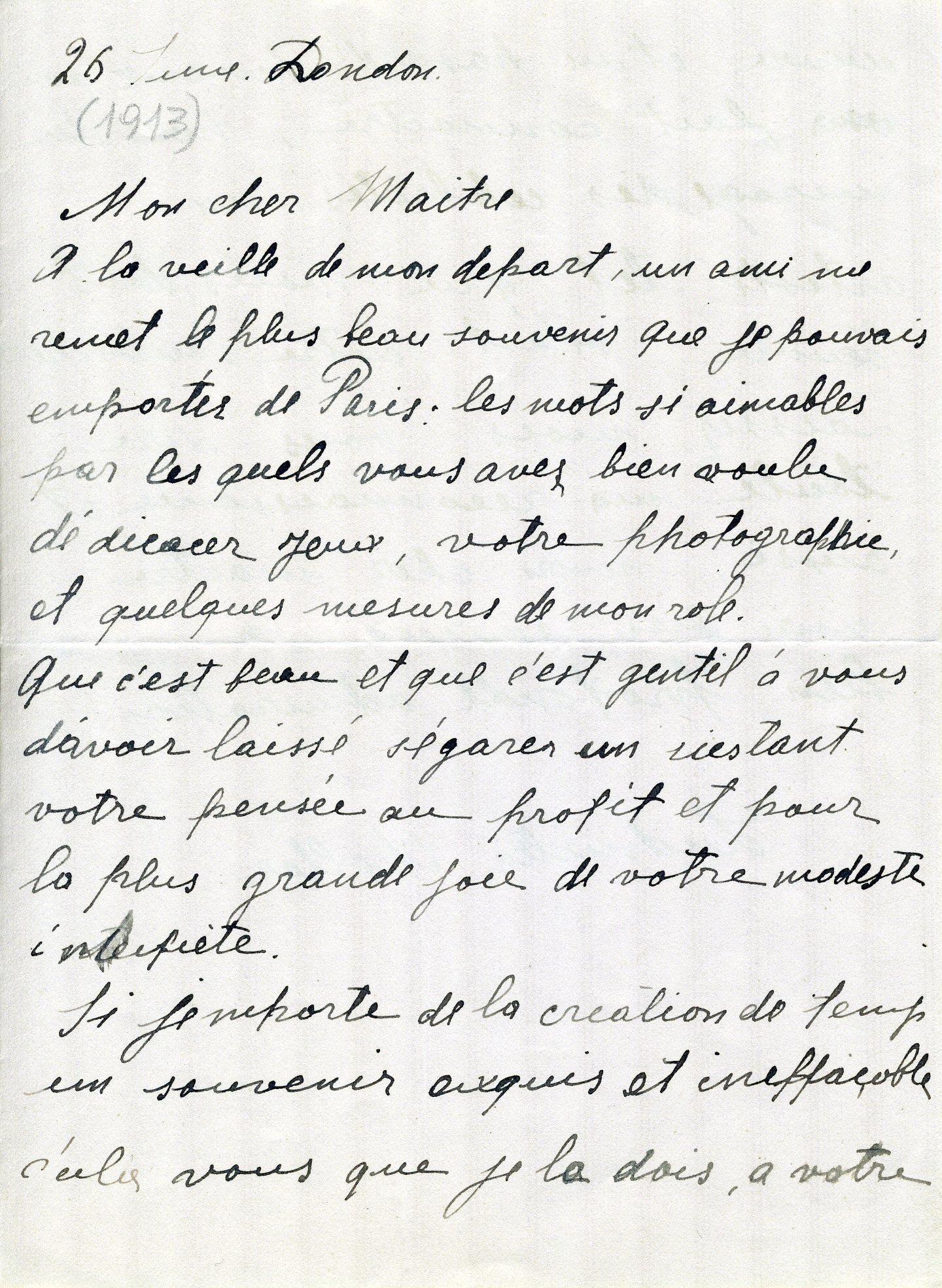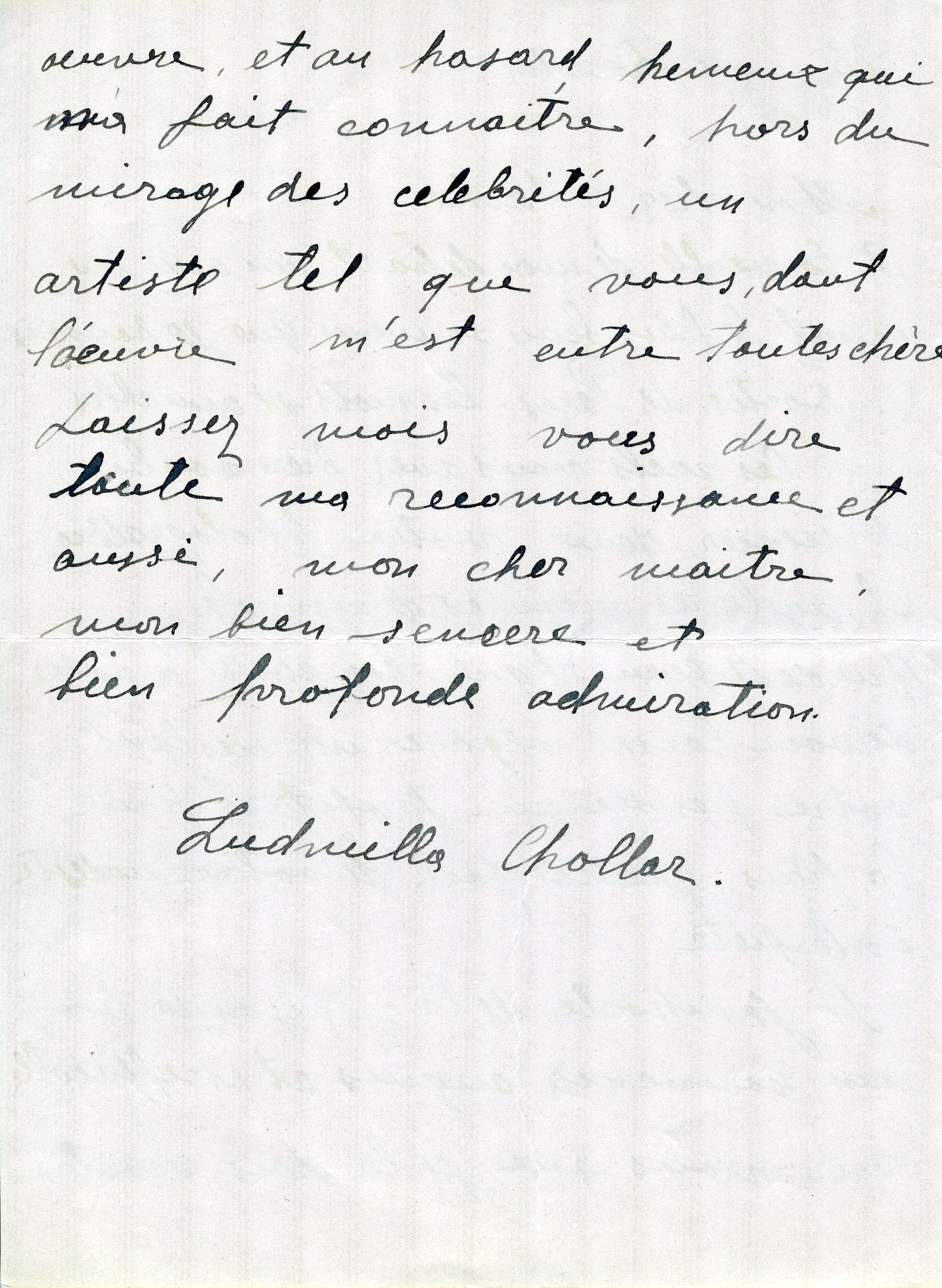 The Russian ballerina and soloist with the Ballets Russes, Ludmilla Chollar writes to Debussy about her role in Jeux, in which she starred with Nijinsky and Tamara Karsavina (London, June 26, [1913], 2 pp.). She thanks the composer for the "the most beautiful memories which I could bring from Paris: the very kind words with which you dedicated Jeux, your photography, and some measures of my role [...] If I take from the creation of Jeux one exquisite and ineffable memory, it is to you that I owe it, to your work, and to the happy chance that I met you, away from the mirage of celebrities, an artist as great as you, whose work is dear to me above all others."